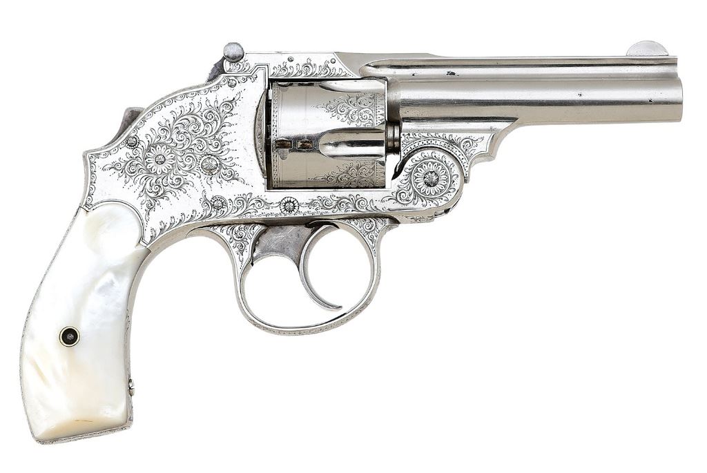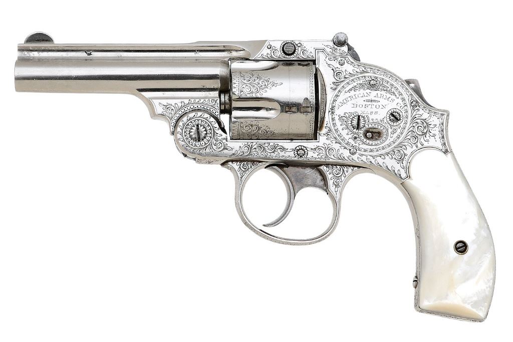 38 S&W, 3 1/4'' barrel with a bright excellent bore showing a few oxidation speckles and crisp rifling. This is an interesting American Arms Co. safety hammerless revolver that has been factory engraved perhaps for some exhibition happening at the time; the work is arguably of exhibition quality. The frame is embellished in near full coverage with further flourishes along the cylinder and barrel edges featuring lovely fine English filigree scrollwork, geometric borders and subtle acanthus motifs. The patent dates along the topstrap and maker's information on the left sideplate are also neatly engraved rather than stamped and all of these embellishments remain completely intact and crisp. The metal surfaces retain about 96-97% original nickel finish showing a few light flakes along the sides of the barrel and otherwise just a few light handling marks. The trigger and manual safety retain strong smoky case-hardened colors and the latch retains some hints of fire blue. The front sight blade is somewhat bent to the left. The revolver wears a set of smooth mother-of-pearl grips that remain in excellent condition. Barrel-to-frame fit is solid and the action will require some mechanical attention as the firing pin is stuck forward causing the cylinder to not cycle properly. This is a very fine and almost certainly unique example of these low-production revolvers for the antique arms collector. (13B11726-3) {ANTIQUE} (1200/1800)