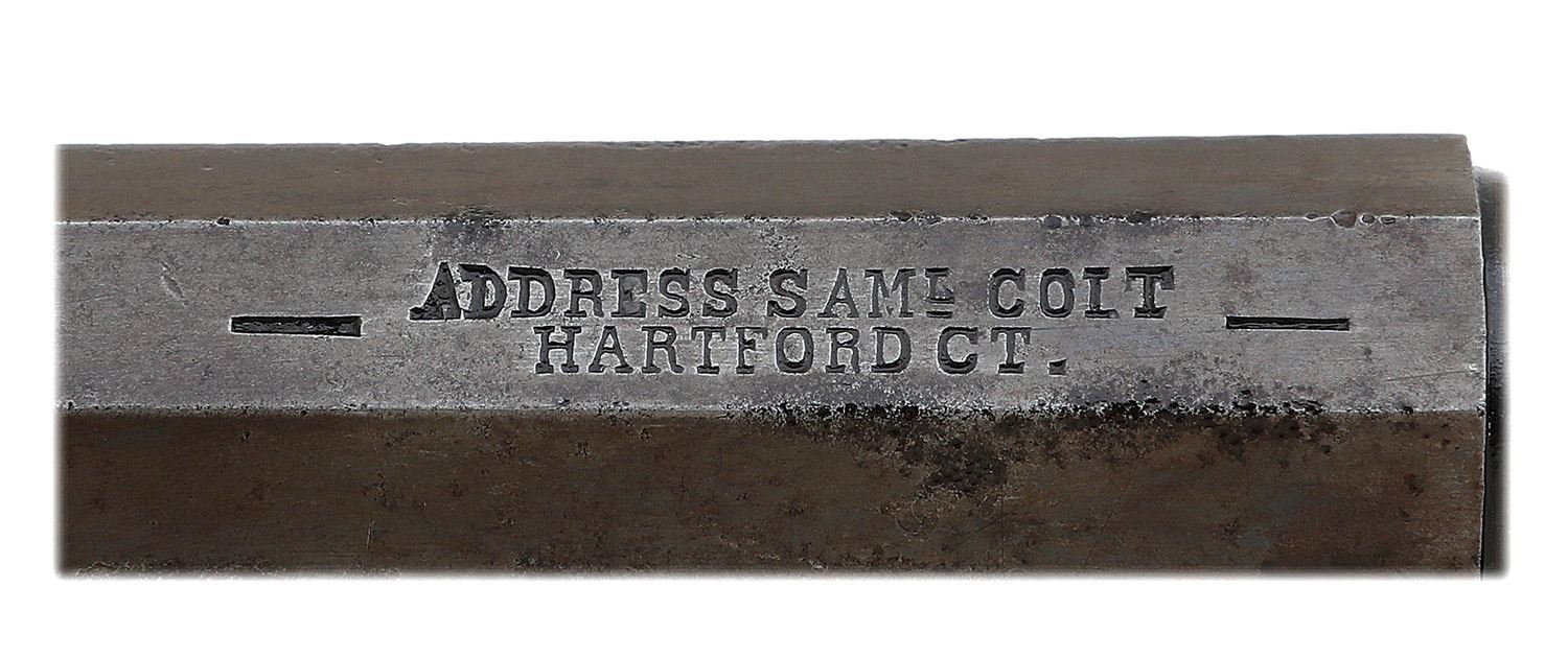 serial #200386, .31 cal, 5'' octagon barrel with a mostly bright very fine bore showing a few areas of light oxidation and pinprick pitting with otherwise crisp rifling throughout. This 1862-made revolver is a very late example bearing the desirable two-line Hartford address. The barrel has mostly flaked to a mottled gray-brown patina showing some scattered areas of light pitting and some generous original bright blue in the more protected areas. The six-shot cylinder retains a great deal more original bright blue, perhaps 60%, again showing some flaking and areas of old light pitting, the stagecoach scene remaining over 90% intact and quite crisp. The loading lever and frame retain a healthy amount of fine vibrant case-hardened colors throughout, the left side of the frame with some light pitting, and the back side of the hammer also shows lovely case-hardened colors. The sides of the trigger and a few of the screw heads retain good fire blue while the triggerguard and backstrap retain about 65-70% silver finish thinning to mild goldenrod along the straps. The smooth walnut grip remains in near excellent condition with about 97% original varnish and just some light handling marks. The wedge is an older gunsmith-made un-numbered replacement, the remaining serialized parts are matching and the action seems to function well mechanically. The included mahogany case is of older construction showing scattered light dings and mostly worn finish, the lock escutcheon having been lost to the years. The interior is lined in red velvet and the revolver does not quite fit perfectly but appears to have been resting in the case for a long time. The case contains a small Federal Eagle flask with a few scattered dents, dual cavity Colt Patent bullet mould showing moderate wear and Eley cap tin. A rather nice example with desirable barrel address. (13C11641-6) {ANTIQUE} (2000/2500)