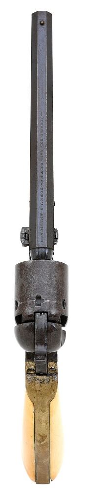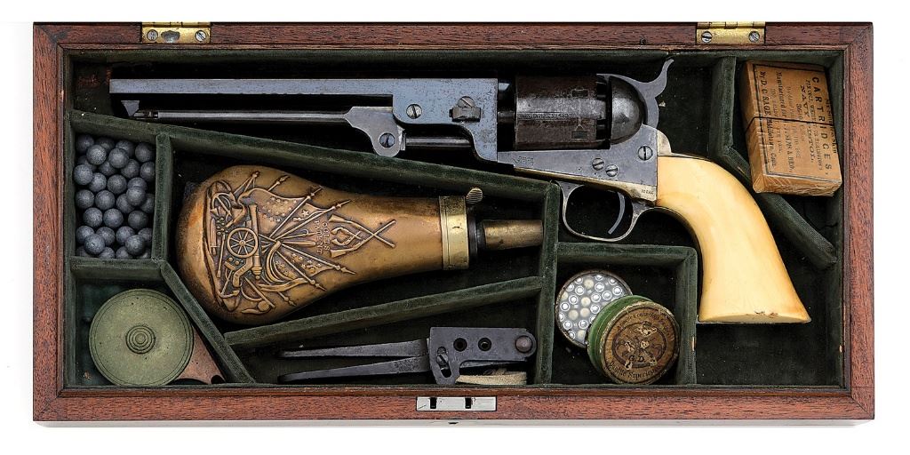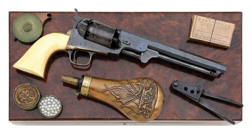 serial #174333, .36 cal, 7 1/2" octagon barrel with a partially bright about very good bore showing some overall light pitting and otherwise strong rifling throughout. The barrel of this 1863-made revolver retains about 80% original bright blue showing edge wear, some light dings on the right side near the wedge and scattered flaking to pleasant gray-brown patina. The cylinder has mostly toned to a mild gray-brown patina showing a little scattered pinprick pitting, the naval engagement scene shows some obscured areas but remains mostly intact and the safety pins are also mostly present. The frame, hammer and loading lever show wisps of vibrant case-hardened colors in the protected areas toning to a pleasant mild gray patina and showing a few minor handling marks. A smaller notch has been neatly cut into the hammer just to the right of the factory rear sight notch. The backstrap and triggerguard have mostly toned to a mild ocher patina showing a few scattered light dings and some tarnished silver finish around the triggerguard. A few screw heads retain nice fire blue and the New York barrel address and other markings remain intact and strong. The revolver is fitted with an attractive antique smooth ivory grip that remains in very fine condition showing some scattered light handling marks, nice striations throughout and is taking on a pleasant patina overall. The grip is un-numbered and the remaining parts are matching including the wedge. The action seems to function well mechanically with solid timing and lock-up. The revolver comes in a very attractive period case that shows some light scuffs and dings along the exterior, the lid with some particularly lovely burl grain figure throughout; the case is a bit large for the gun and appears to be for a Model 1860 Army. The interior is lined in green velvet showing some honest light wear and the case contains a Colts Patent stand of arms powder flask that shows some dings along the back and is missing a lid screw, moderately oxidized multitool and dual cavity Colts Patent bullet mould, capping tool that shows an old cleaning and some verdigris, key, partial container of French-made caps and what appears to be an original six-round packet of cartridges by D. C. Sage in lovely condition. A very attractive wartime Navy Model with a handsome set of grips and in a nice case. (13C11641-3) {ANTIQUE} (4000/6000)