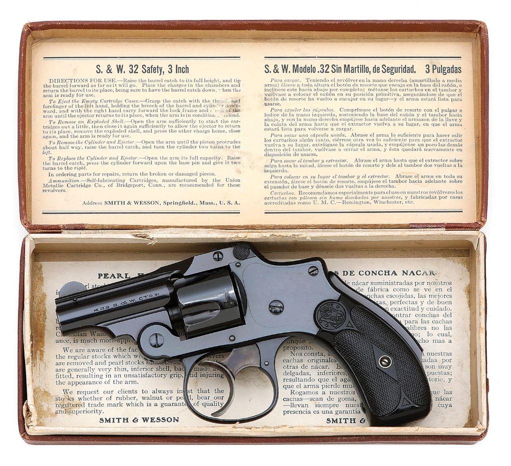 serial #122791, 32 S&W, 2'' barrel with a bright excellent bore. The metal surfaces of this Second Model revolver retain 99% original blue, showing only minimal handling wear overall with a few negligible flecks of scattered oxidation staining and light edge silvering, with the trigger toning to a handsome brown patina and showing bold case-hardened colors. The checkered hard rubber grips remain in excellent condition showing little if any handling wear and toning to a deep chocolate brown. Timing and lockup appear sound and the ejector functions robustly with strong spring and snap, and the grip safety functions as it should. Included with this lovely revolver is a hinged brown box labeled for this gun's 3'' variant, which remains excellent overall with minimal soiling or edge wear. An excellent Second Model in a state of condition not often encountered. (26A10826-340) {C&R} [Dr. W. Lloyd Hudson Jr. Collection] (2000/3000)