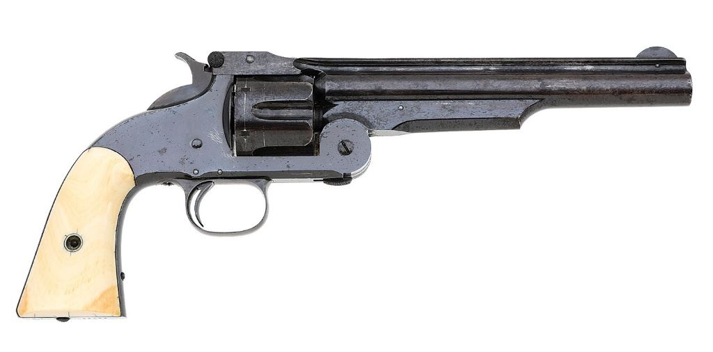 serial #29284, 44 S&W American, 7'' barrel with a mostly bright very good plus to very fine bore showing a few small patches of moderate oxidation and otherwise strong rifling throughout. This is a nice revolver with rare 7'' barrel and nice set of original antique ivory grips. The metal surfaces retain about 70% original bright blue with some moderate flaking along the sides of the barrel and cylinder flats toning to a deep gray-brown patina along with some old oxidation speckling and fine scratches scattered about. Some of the frame screws show a little old slot wear and the single line barrel address and patent dates remain mostly crisp. The hammer shows nice vibrant case-hardened colors while the triggerguard retains some good smoky wisps and the trigger and latch show strong gray oil-quenched case-hardening. The revolver wears a fine set of original period smooth ivory grips that remain in excellent condition showing a few honest thing age checks forming, nice striations and an attractive patina. The right panel is in fact pencil-numbered to the gun and the other components are matching by assembly number. Barrel-to-frame fit is excellent and the action is crisp and seems to function well mechanically. A very fine and desirable example for the antique S&W collector. (13B10826-457) {ANTIQUE} [Dr. W. Lloyd Hudson, Jr. Collection] (4000/6000)