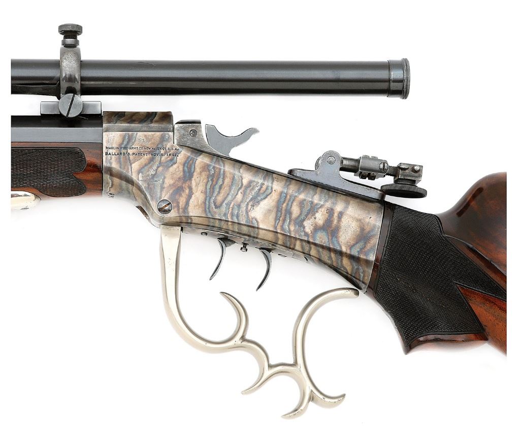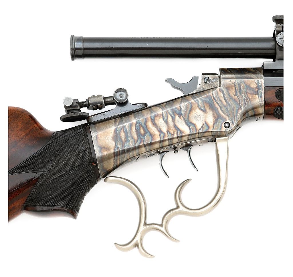 serial #23048, 33-40, 31 3/4" No. 4 weight full octagon barrel with an excellent bore. This is a classic full Stevens custom Ballard with a Ross rifled Stevens barrel. The rifle features Stevens Pope Special stocks, lever and palm rest along with a Pope windage adjustable folding tang mounted peep sight and globe target front sight. The Stevens barrel is factory numbered to the action and bears Ross' mark beneath the forend "R / 3" as well as "HMP". This ''HMP'' mark is thought to be an indicator of Pope's approval of a Fred Ross rifled barrel. The condition of the rifle is superb with the barrel retaining about 98% original blue finish with just the slightest wear on the high edges. The frame retains 97% vivid original Stevens color case-hardened finish. The checkered pistolgrip walnut buttstock and forend retain 95% original finish with quite strong checkering. The forend checkering is fine and fancy and cut around the Pope palm rest. The stock shows several cracks at the action. These have been repaired some time ago and seem sound; the time and expense should be invested to have a top shelf professional properly repair these cracks - the rifle is more than worthy of the effort. The rifle is equipped with factory adjustable double set triggers, original false muzzle and wooden loading rod. In addition to the open sights the rifle is equipped with a Stevens 475 telescopic sight mounted on target blocks and rating excellent with slightly cloudy optics. The barrel is also cut for Pope mounts. Fred Ross was a well-respected competitive shooter and an employee of Stevens who worked as Harry Pope's assistant. Ross was also an accomplished barrel maker and after Pope's departure in 1905, Ross took over barrel making responsibilities for the custom and Schuetzen department. This rifle bearing Ross' number 3, is a very early example of his Stevens barrels of which only a handful are known. An extremely handsome and high condition example of these fine Stevens altered Ballard rifles formerly of the prestigious Warren Greatbatch Collection. (1E11511-24) {ANTIQUE} [Dr. Robert Davis Collection] (10,000/15,000)