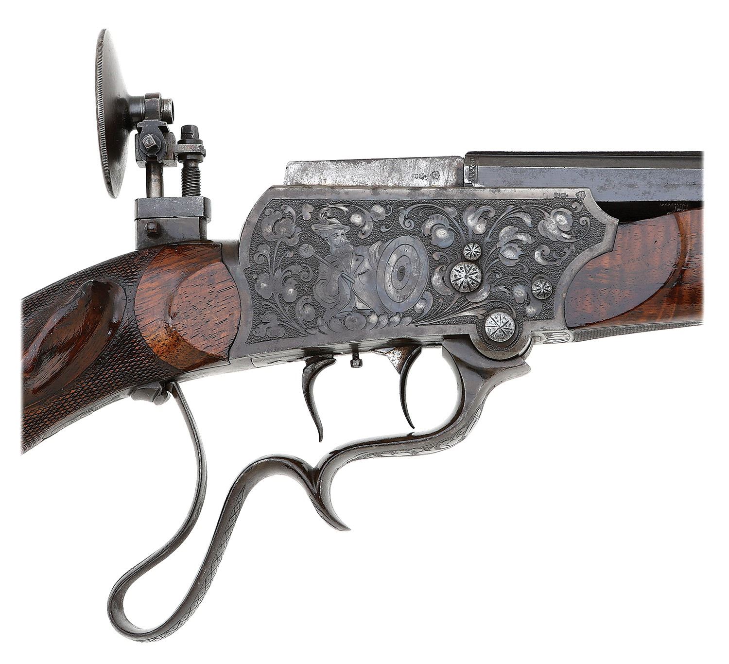 8.15x46R, 30 3/4'' octagon barrel with a bright very fine bore showing some scattered small areas of light oxidation and otherwise crisp rifling throughout. The barrel retains about 85% original blue appearing stronger under ambient light with areas toning to mild gray-brown patina under bright light and some scattered old oxidation. The top flat is neatly matted and grooved for sights, also showing ''SYSTEM ALBRECHT'' in silver. The action retains perhaps 80% nice original case-hardened colors that remain mostly vibrant with areas toning to gray-brown and showing some scattered mild oxidation speckling. The action is extensively embellished with wide flowing Germanic foliate motifs and punch-dot shading with subtle burnishing accents, the left with renaissance rifleman and the right with a target scorer holding target. The smooth walnut forend remains in fair condition showing some moderate chips along the length of the right side and the buttstock remains in about very good plus condition showing overall light dings and handling marks. The checkering remains mostly intact and strong and the stock features medium-sized left-side rams horn cheekpiece and right-side thumb rest. The schuetzen buttplate shows some moderate old oxidation mixing with vibrant wisps of case-hardened colors and the rifle is equipped with sling swivels, double set triggers, fully-adjustable tang sight with wide aperture disc numbered ''15211'' and protected ramp front sight with three selectable posts. The breechblock drops straight down on this system and it also features a takedown mechanism with lever on the underside of the forend that unlatches and lifts up the barrel to be easily removed. This is a nice example of what appears to be a fairly obscure system. (13D11108-62) {C&R} [Tom Devers Collection] (2000/3000)