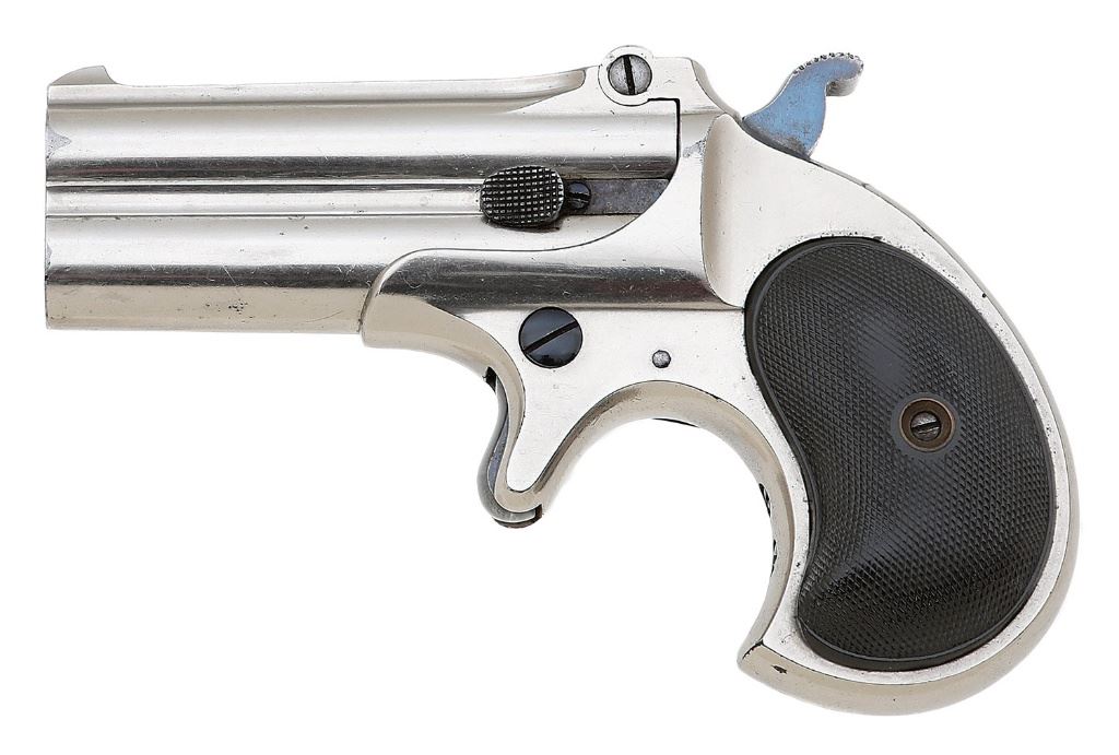 serial #150, 41 RF, 3'' barrels with bright near-excellent bores showing minor frosting and oxidation staining with strong rifling throughout. The metal surfaces of this Type II deringer retain 98% original nickel finish, showing scattered light handling and high edge wear with minimal clouding throughout. The blued components have toned largely to a gunmetal patina with generous fire blue remaining visible on the sides of the hammer and the protected areas of the extractor. The checkered hard rubber grips remain in excellent overall condition showing only some mild softening at the high points. The gun locks up tightly and appears to function well mechanically. A nice Model 95. (26A10826-171) {C&R} [Dr. W. Lloyd Hudson Jr. Collection] (1500/2000)