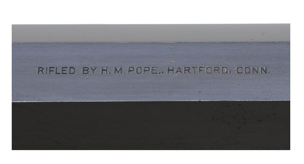 serial #31789, 32-40, 30" No. 4 weight (Hartford Pope #178) octagon barrel. This rifle is built on an original Ballard 6 1/2 faceted action with very nicely executed game scenes on both sides surrounded in scroll and geometric border motif. The barrel is a Winchester barrel which is marked "RIFLED BY H.M. POPE HARTFORD, CONN" and bears his number and code "178" and "18/1.24". The rifle is stocked with a wonderful French walnut pistolgrip stock with extra drop, no cheekpiece and a custom nickel plated and checkered Schuetzen buttplate. The rifle features a Ballard No. 6 lever and a beautifully crafted set of period custom double set triggers. The forend is a factory Ballard forend with horn insert at tip which has been custom fit to this barrel and is equipped with a Pope palm rest. The barrel is machined for Pope scope mounts which hold a Lyman Field 438 telescopic sight, the rear dovetail is filled with an interesting round disc topped blank, a globe target front sight is present along with a Pope adjustable tang mounted peepsight. The condition of the rifle is quite nice with the barrel retaining about 95% evenly thinning original blue finish with silvering along the high edges. The action retains 85% original color case hardened finish which has softened slightly but has a wonderful appearance. All engraving and markings remain sharp and crisp. The stocks rate excellent retaining 95% original finish with one short and stable crack where stock meets action. The rifle is complete with its original false muzzle which is properly numbered to the barrel. The rifle comes with a leather luggage style shooters kit consisting of a Hartford Pope duplex powder measure, a double cavity Pope mould, brass starter numbered to the barrel, a Pope re-decapper, a Pope grease pump, wad punch, breech seater, oiler, primers, cast bullets, cases and a letter in a 1967 postmarked envelope addressed to Ron Wozny stating that this rifle #178 came from the Frank Sargent collection. The letter goes on to talk about some other guns and is signed "Schappert"; the envelope was postmarked in Des Moines, IA and shows no return address. The leather case housing the accessories was purchased in Seattle by Bob Carow who sold it to Gary Quinlan who put it together with the tools for this rifle. This rifle is fully illustrated and discussed on pages 178 and 179 of Warren Greatbatch's H.M. Pope, Hartford Volume I. In the book he states that this rifle was originally built for Professor Farr of Harvard University probably in 1898. This rifle has been part of some of the finest American Single Shot Rifle collections including those of Ron Wozny, Gary Quinlan, Warren Greatbatch and of course Dr. Robert Davis. An extremely fine and very attractive period custom Ballard-Pope muzzle loading target rifle. (1F11511-26) {ANTIQUE} [Dr. Robert Davis Collection] (15,000/25,000)