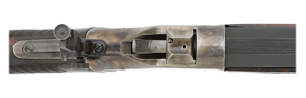 32-40, 32'' matted part round part octagon barrel with a bright near excellent bore showing a little fine oxidation or frosting in the grooves and otherwise crisp rifling throughout. While unmarked as to the maker, this rifle bears a myriad of features popular in the California schuetzen scene of the time and was very likely assembled by O. A. Bremer of San Francisco. The barrel retains about 95% older reapplied polished blue showing some areas toning to mild gray-brown and some small spots of fine oxidation staining or pinprick pits, mostly unobtrusive and visible under bright light. The barrel weight stamp has been lost to the refinishing but it appears to be a No. 4, and the top was neatly matted, likely in California with fine square matting. The action and fancy spur lever retain about 95% fine quality older restored case-hardened colors with some areas taking on a pleasant silvery tone and showing a little sparse gray speckling, the colors along the lever are particularly attractive and vibrant. The lower tang no longer bears any number. The checkered pistolgrip walnut buttstock and schnabel forend with ebony insert tip are in classic California form featuring long thin diamond checkering, pointed leaf-shaped shadowline cheekpiece on the left side and high point of comb that drops off rather abruptly. The stocks rate about very fine with strong original varnish and some scattered light dings and handling mark, the forend with a thin 1 1/2'' flexing crack at the right edge tip and the buttstock with a partially repaired small flake and 1/2'' u-shaped crack left of the upper tang. The buttstock shows some nice grain figure throughout, the base of the pistolgrip is stamped in serifed font ''A L'' and the schuetzen buttplate retains about 94% original nickel finish. There is palm rest hardware installed on the underside of the forend (the rest itself not present) and the rear sight dovetail is blanked. The rifle is sighted with a mid-range Vernier tang sight and windgauge target globe front with dried-out spirit level missing one of its end caps; the front sight insert is a medium aperture. The double set triggers have also been modified to be single acting and the action seems to function well mechanically. A lovely West Coast High Wall schuetzen rifle. (13D11004-9) {C&R} (4000/6000)