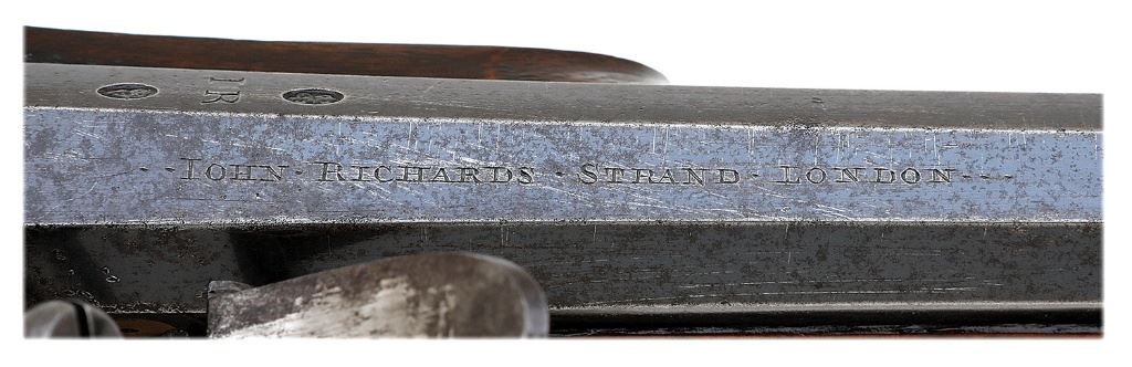 .57 cal, 10'' octagon barrel with a bright very fine smooth bore showing some small areas of light pinprick pitting. This pistol remains in the original flint though the cock has been replaced and the sliding safety is also a rather crude replacement. This is otherwise a very attractive pistol, the barrel retaining about 60% original bright blue flaking to mild gray-brown patina and showing some scattered pinprick pits and old oxidation speckling. The vent is nicely gold-lined and the barrel retains crisp ''IOHN RICHARDS STRAND LONDON'' address and London proofs on the left. The breech tang and lockplate show nice smoky gray case-hardening throughout showing nice panoply of arms and light bordering embellishments, the lockplate with sun ray motif behind the pan, and the frizzen spring with nice brilliant fire blue. The lock features waterproof pan and bridled roller frizzen and the triggerguard retains about 80% original bright blue with panoply of arms along the bow and a very handsome pineapple finial. The finely checkered walnut stock remains in very fine to perhaps near excellent condition retaining strong original varnish and showing a small drying crack ahead of the lockplate and some other scattered light dings. Hardware fit remains excellent, the checkering is quite crisp and there is a nice little floral motif lightly carved along the butt. The original horn-tipped ramrod with worm end is present and the pistol is sighted with wide u-shaped rear sight and small silver bead front. Equipped with single adjustable set trigger, the lock will require some mechanical attention as it does not hold at full cock but does hold at half. A fine quality British pistol likely made toward the end of the flintlock era. (13C11579-9) {ANTIQUE} (3000/5000)