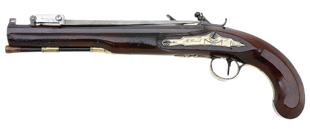 .60 cal, 10'' octagon barrel with a moderately oxidized bore. This pistol has been nicely reconverted to flint, the barrel and lockplate retaining about 90% of an older restored plum-brown finish with some sparsely scattered small areas of cleaned light pitting. The barrel flat shows a pair of impressed ''(Crown) / (Crossed Scepters) proof marks and the fullered cruciform bayonet measures 7 1/4''. The lockplate shows maker's name in script and it features a bridled waterproof pan, the cock with a small crack forming at the neck. The pistol is equipped with brass fittings including thimble, tailpipe, triggerguard with acorn finial and solid sideplate which have toned to a slightly pale ocher patina. The sideplate is neatly engraved with the name ''M. Wood'' in script. The smooth walnut stock with flat-sided grip remains in very good plus condition showing a little older added varnish, a few darkened areas and old dings, the left side with a small crack and small moderate abrasion near the sideplate. The edges and stock fit to the hardware remain quite good and a horn-tipped hickory ramrod is present. The bayonet assembly locks up well and the lock is crisp and seems to function well mechanically. A very good example in a desirable configuration with its distinctive bayonet. (13B11579-10) {ANTIQUE} (2500/3500)