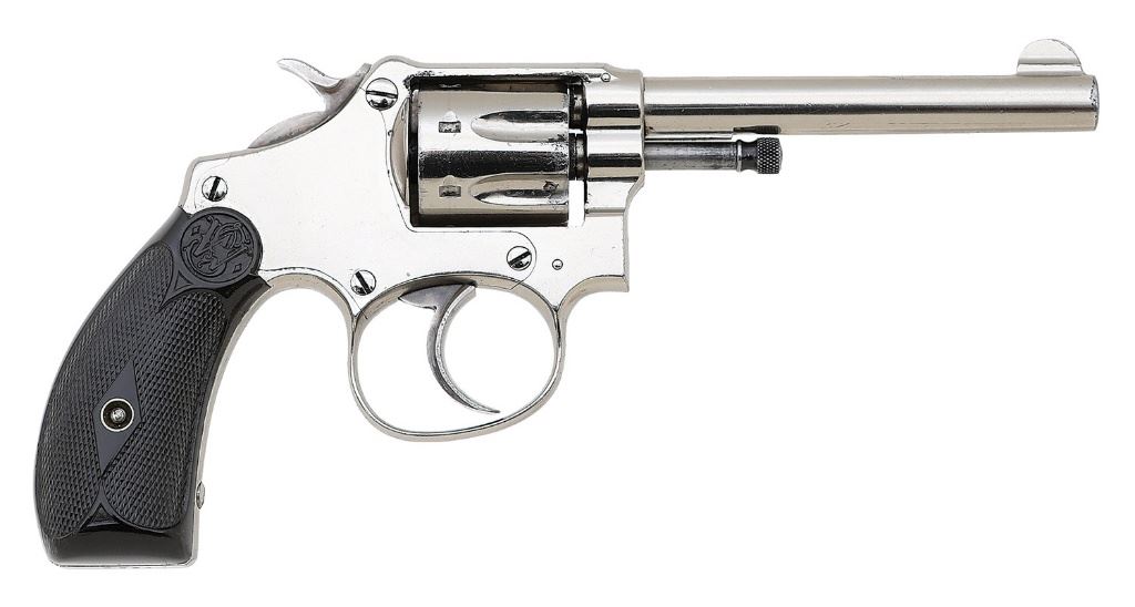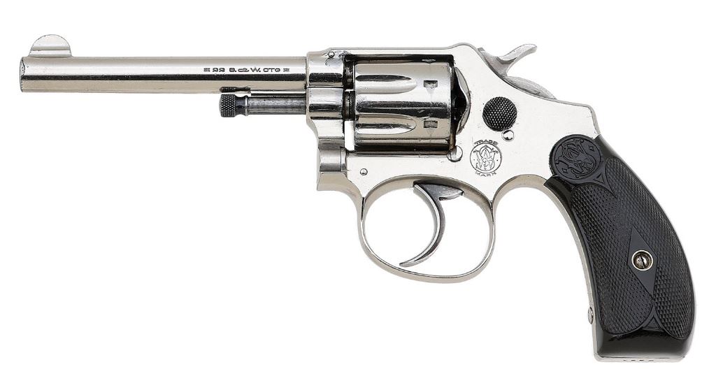 serial #3881, 22 RF, 3 1/2" barrel with a bright very good bore showing scattered fine pinprick pitting with strong rifling throughout. This First Model retains 95% original nickel finish with some high edge wear and light oxidation staining around the muzzle and cylinder with the cylinder having been lightly cleaned, and some fine pinprick pitting bordering the window. The hammer, trigger, ejector rod, and cylinder release have all toned to a gunmetal showing traces of original fading blue and the checkered hard rubber grips remain excellent showing only very light handling wear on the right panel. Timing and lockup appear sound, and this remains a fine example of the ''Model M'' Hand Ejector. (26B10826-554) {C&R} [Dr. W. Lloyd Hudson Jr. Collection] (1500/2500)