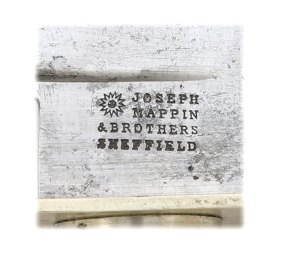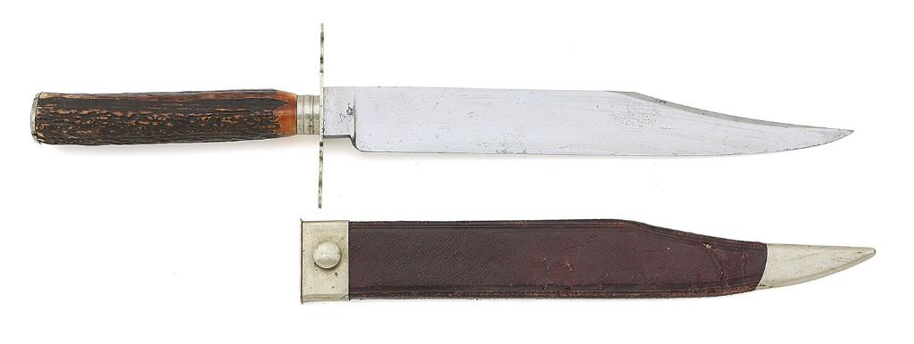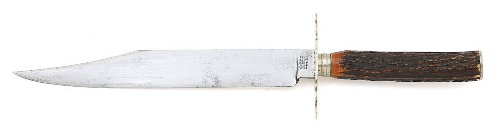 This is an 1835-early1850 English Made bowie measuring 14 7/8'' overall with a 9 5/8'' clip point blade. The blade remains bright with evidence of an old very light cleaning showing some sparsely scattered fine staining and freckling, The obverse ricasso is marked ''JOSEPH / MAPPIN / & BROTHERS / SHEFFIELD'' next to sun cutler mark. The German silver keyhole shaped crossguard, grooved ferrule and flat round buttplate have mellowed slightly with fine staining and a couple tiny impact marks. The round staghorn grip remains excellent having acquired an appealing dark caramel color with age. The red leather scabbard with German silver frog stud collar and tip remain near excellent. The body shows light wear and two small tears in the obverse center, the German silver mounts show light staining and handling marks. Joseph Mappin started making knives in 1810 and added the well-known sun cutler mark to his Joseph Mappin & Brothers mark when it was awarded to him in 1835, in 1852 the name was changed to Mappin Brothers when all the sons entered the business. A lovely, fine condition Sheffield bowie. (5C11199-157) (1200/1800)