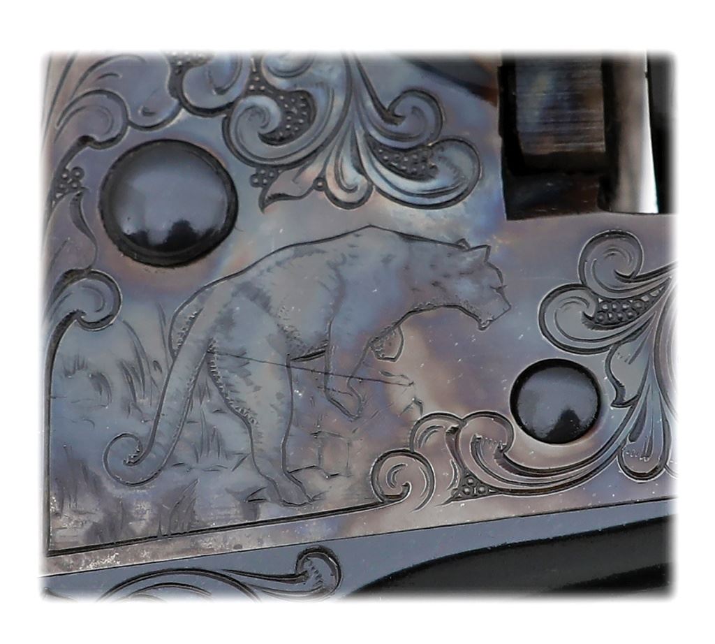 serial #59812SA, 45 Colt, 4 3/4'' barrel with a bright excellent bore. This handsome 1971-made Second Generation revolver was engraved in 1979/80 by master engraver Bill Burt, apparently after a successful cougar hunt by the original owner, and the original invoice detailing the work is included along with a photograph of said dispatched cougar. The revolver had a new barrel installed by Colt and was factory-refinished in preparation for the engraving now rating as-new with 99% blue and vibrant case-hardened colors, the polished sides of the hammer remaining brilliant. The metal surfaces are engraved in near full coverage with lovely crisp and clean detailed flowing foliate scrollwork and fine punch-dot background shading. A small but finely detailed cougar scene graces the right side of the frame, commemorating the history of the gun in style. The right side of the frontstrap beneath the grip is neatly signed ''COLT ENGRAVER R. BURT'' and the original factory markings also remain intact throughout. The revolver wears a nice smooth one-piece ivory grip in excellent condition showing a few minor handling marks and a mellow patina with subtle grain striations and some slight cracking along the base. The action seems to function well mechanically with a crisp hammer. The included 1980-dated invoice notes the revolver by serial number and details the following work: Barrel 4 3/4'', Type ''D'' engraving by Class I engraver, Engrave Cougar in suitable location (not inlaid), Double Presentation case. The case is not present. This is a lovely revolver with tasteful and excellent quality embellishments from a well-regarded factory engraver. (13D11523-119) {C&R} [Jim Thrash Collection] (6000/8000)