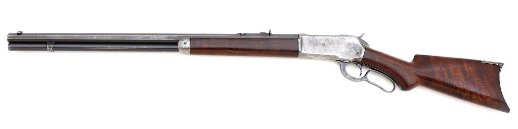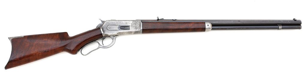 serial #84614, 40-70 WCF, 26'' octagon barrel with full magazine and a mostly bright very good plus bore showing a little scattered mild oxidation and pinprick pits in the grooves with otherwise mostly crisp rifling throughout. The barrel and magazine tube of this 1894-made rifle retain about 50% original blue appearing stronger under ambient light with overall toning to a medium gray-brown patina showing some scattered light dings and old oxidation staining. The left and right flats of the barrel ahead of the nosecap are stamped in antique serifed font ''G.TOWERS.'', obviously applied during the period of use and probably the name of the original owner. The action retains perhaps 65% good original case-hardened colors that are drifting to an attractive silvery patina and showing a bit of light oxidation staining and speckling with vibrant wisps in the more protected areas. The loading gate shows faded blue and the bolt retains about 85% original bright blue. The smooth walnut forend remains in very fine condition with scattered light handling marks while the plain pistolgrip buttstock is closer to very good as lightly cleaned and showing a repaired break at the wrist with some synthetic filler around the upper tang and a rectangular walnut patch on the right side of the grip. The ebony pistolgrip insert is intact and the sides of the buttstock actually show some rather nice grain figure. The upper tang inlet of the stock and inside toe of the buttplate show matching assembly number to the action tang. The rifle is equipped with special order factory single set trigger which seems to function normally and sighted with standard sporting rear sight and a Lyman bead front sight that is missing its insert. The included factory letter confirms the configuration of the rifle and indicates it shipped on June 14, 1894. A very respectable antique 1886 in 40-70. (13D11523-33) {ANTIQUE} [Jim Thrash Collection] (3500/5000)
