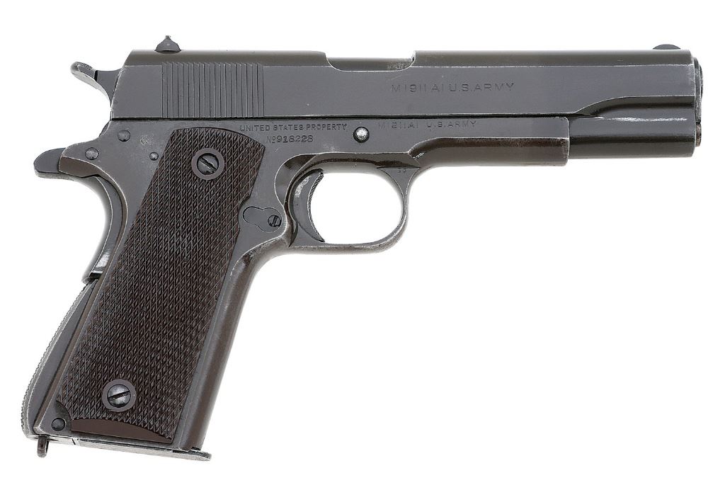 serial #918228, 45 ACP, 5'' Colt barrel with a lightly oxidized and pinprick pitted bore showing strong rifling throughout. The slide is not numbered under the firing pin retention plate and is likely a replacement although the patent dates, barrel address, and Rampant Colt are correct for the era. The metal surfaces retain about 85% original Parkerized finish showing light scattered edge wear, spots of oxidized pitting on the frame, plus assembly and handling marks. The checkered synthetic Coltwood grips feature reinforcing ribs on the back, reinforcing ribs around the screw holes, and remain in excellent condition. Most of the small parts appear correct for the frame, the slide stop appears to be an earlier replacement, and the mainspring housing has the later coarse checkering. The slide sports the earlier round front sight and ''U'' notch rear sight. General Drewry's inspection mark as well as the various proofs and ordnance wheel remain crisp. It includes a generic corrugated box, a single Colt seven-round commercial magazine, and a single M.S. Little Company marked seven-round magazine with welded floorplate. Also included is a black U.S. Model 1916 flap holster by Boyt dated 1944. The holster shows light to moderate wear to the finish and strong stitching. A fine 1911A1 for your collection. (8A11700-23) {C&R} (2000/2500)