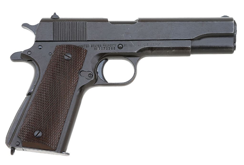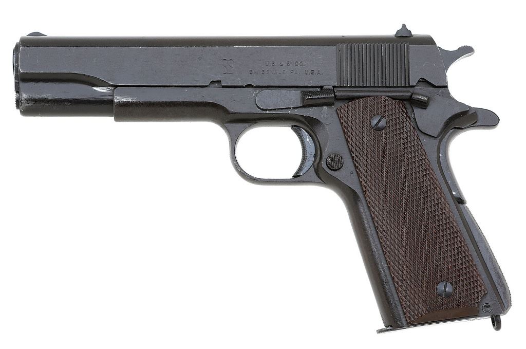 serial #1072166, 45 ACP, 5'' High Standard barrel with an excellent bright bore. This lovely mid-war gun remains in fine condition. The metal surfaces retain about 90% original dull-gray Du-Lite over sandblasted finish which is stronger under ambient light having toned to brown under strong light in addition to light edge wear, plus handling and assembly marks. The fully checkered Keyes Fibre grips feature reinforcing bars on the rear of the panels, no reinforcing rings around the screw holes, and remain in wonderful condition. All the controls and small parts appear correct for the period of manufacture, Lt. Colonel Downie's inspection stamp and the proof marks are crisp as are the other markings. It includes a Scovill Manufacturing seven-round magazine with welded base. Manufacture of U.S.&S. Model 1911A1s is miniscule compared to the others of the period. Finding one with original parts and fine condition is a fleeting opportunity for the collector. (8B11798-3) {C&R} (6000/8000)
