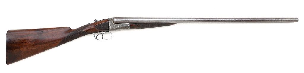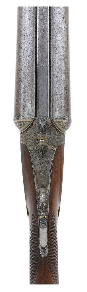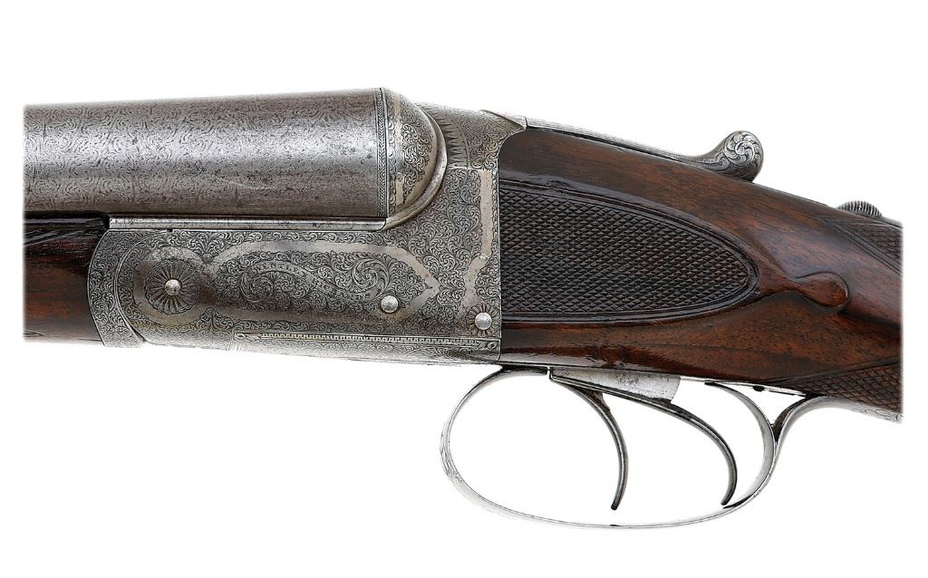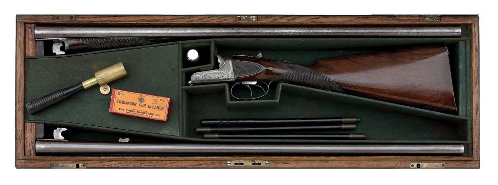 serial #13578, 12 ga (2 1/2''), 30'' damascus barrels choked cylinder and modified with bright very fine bores showing a little stubborn fouling and a few small spots of light oxidation in the left bore and 30'' damascus barrels choked full in both with bright very good plus bores showing some scattered areas of light pitting, more so in the right bore. The first set of barrels retain a healthy amount of original plum-brown finish with overall fading and toning to a pewter gunmetal patina with a few areas of mild pinprick pitting and softened damascus patterns that are otherwise quite strong throughout. The second set of barrels retain a great deal more plum-brown finish, perhaps 85-90%, showing some light handling marks, oxidation speckles and fine swirling damascus patterns throughout. Both sets retain strong engraved maker markings and 170 New Bond St. London address along the ribs. The action retains generous wisps of case-hardened colors lurking about, drifting to a pleasant mix of silvery and smoky gray case-hardened patina, the triggerguard mostly toned to gunmetal with the inside of the guard retaining some good original bright blue. The action is embellished in full coverage with lovely English filigree scrollwork and maker's name in riband, the bow of the guard with a slightly softened game scene of a pointer and a few pheasant. The checkered walnut buttstock and splinter forend with horn tip remain in very good plus condition showing a slightly worn oil finish with scattered light dings and handling marks, otherwise maintaining an honest appearance overall and good subtle grain figure. The checkering shows modest wear, the cheeks also being checkered, and the drop points well-defined. Stock fit remains very nice and it features a checkered butt with toe and heel plates along with a silver monogram plate neatly engraved with the Robertson clan crest over the initials ''W. St. L.R.'' (William St. Leonards Robertson). Common with early Anson & Deeley actions, the gun locks up only via the Westley Richards patent top bolt and dolls head extension and is solid on-face. The gun features automatic safety, double triggers, extractor, silver bead front sights and the action seems to function well mechanically. Length-of-pull is 14 3/8'' with drops of about 1 1/2'' and 1 15/16'', the stock with moderate cast-off. The first set of barrels show restrictions of 0.000 right and 0.025 left and wall thicknesses measuring not less than about 0.026'' and the second set of barrels show restrictions of 0.035 right and 0.037 left and wall thicknesses measuring not less and 0.028''. Weight is about 6 lbs. 10 oz. with the first set of barrels and 6 lbs. 11 1/2'' oz with the second set. The gun includes its original leatherbound oak case with Robertson's name embossed on the lid showing some light scuffing and honest wear along the exterior. The green baize interior is in fine condition with light wear and the lid labels are intact as well. The case contains a nickel-plated oil bottle, three-piece ebony cleaning rod, James Dixon ebony-handled chamber brush and a Tomlinson gun cleaner kit in box. The gun also includes a Westley Richards factory inquiry letter and copies of the relevant ledger pages indicating the gun was completed on November 17, 1882 with 14 1/4'' stock length and barrels choked cylinder and full. It was returned in 1883 for installation of the second set of barrels (numbered 13867), ordered by G.M. Bell, Esq. The gun apparently made its way to Robertson (1865-1950), an Australian who saw long and distinguished military service, attending Wadham College at Oxford, serving in the Boer War, was awarded CBE in 1927 and retired as colonel in 1929. There are numerous period photos of Robertson and more information regarding him easily accessible online. We have a companion Westley Richards gun also in this auction numbered extremely close, ''''13525''. This is a very fine gun with interesting provenance from the respected Westley Richards firm. (13D11604-6) {ANTIQUE} (4000/6000)