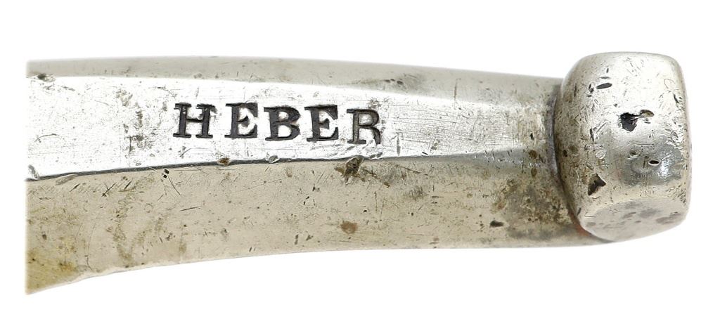 .46 cal, 31'' octagon barrel turned for starter with a bright near excellent bore showing a little mild oxidation about an inch back from the muzzle and otherwise crisp rifling throughout. The barrel has toned to a deep plum-brown patina and the top flat shows fine matting and a pair of neatly filled holes ahead of the rear sight. The right flat is marked ''BROWNING & HEBER / SAN FRANCISCO CAL.'' nearer the breech. The unmarked plain lockplate is a medium gray patina and the breech plug with swirling bolster appears to show some remnants of dark gray oil-quenched case-hardening. The rifle is equipped with a pewter nosecap and German silver hardware including wedge escutcheons, fancy triggerguard, heavy buttplate with iron acorn heel finial and pointed lock screw escutcheon. The checkered walnut stock remains in about very fine condition showing a little older added varnish with some scattered light dings and handling marks. There is a small crack and chip forward of the lock screw and the stock is in California form with long diamond point checkering, subtle side ridges down the wrist and a rounded left-side cheekpiece that is not as pointed as we typically see. The toe of the buttplate is stamped once more with maker's name ''HEBER''. The short tube diopter tang sight and target globe front with fine bead-on-post insert are more modern replacements, the front loose in its dovetail, and the square notch rear leaf sight is somewhat rudimentary in construction. The lock is single-acting and equipped with a thin straight firing trigger and seems to function well mechanically. A simple brass-tipped hickory ramrod is present along with a more modern nicely made brass-bodied starter. This rifle is pictured and described on pages 292 and 293 of ''The American Percussion Schuetzen Rifle'' by Hamilton & Rowe, in-which they conjecture that it may have been Heber's personal rifle given the extra stamp on the buttplate toe. A fine rifle from this rather short-lived partnership between August Browning and William Heber, made between 1873-1877. (13C11108-73) {ANTIQUE} [Tom Devers Collection] (2000/3000)