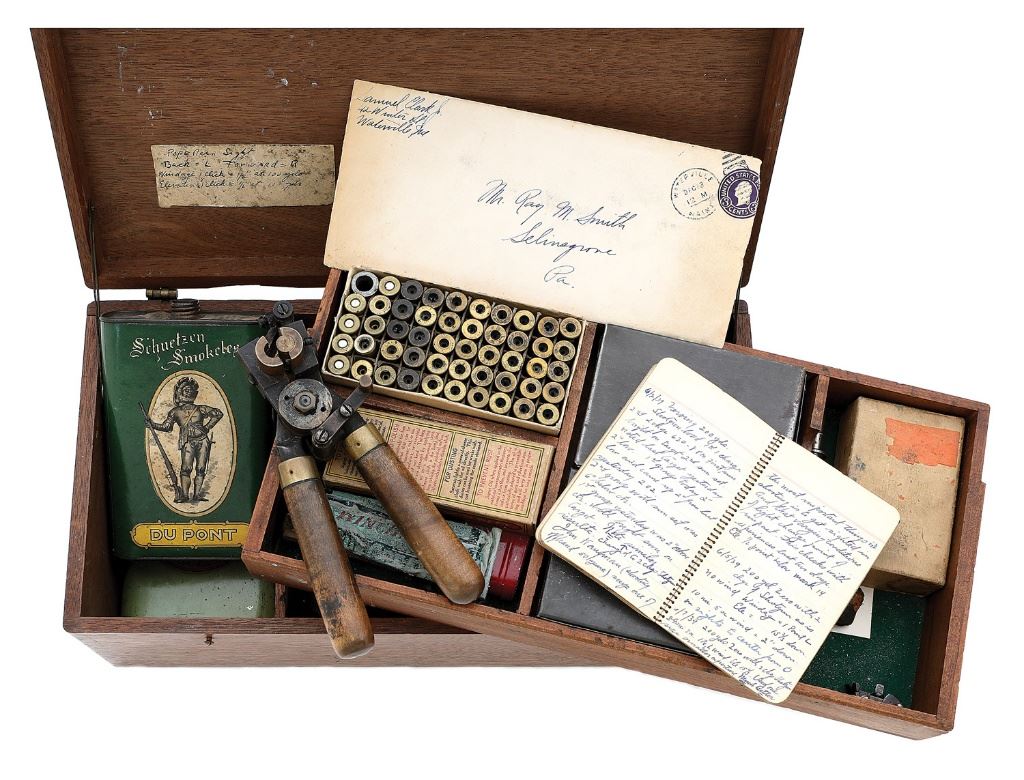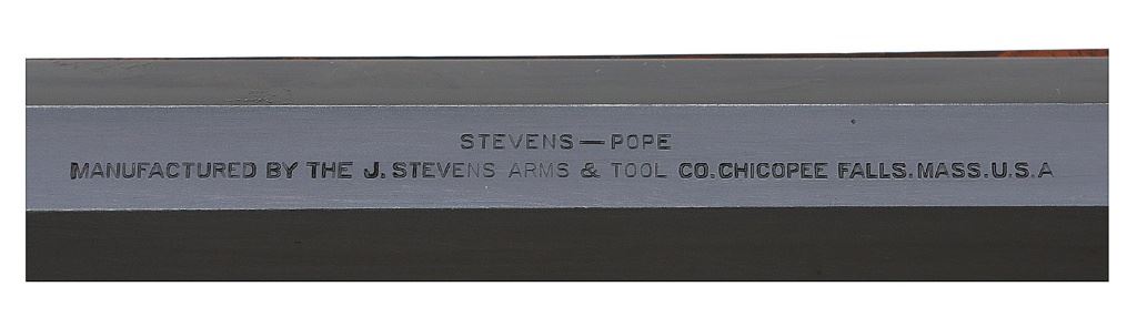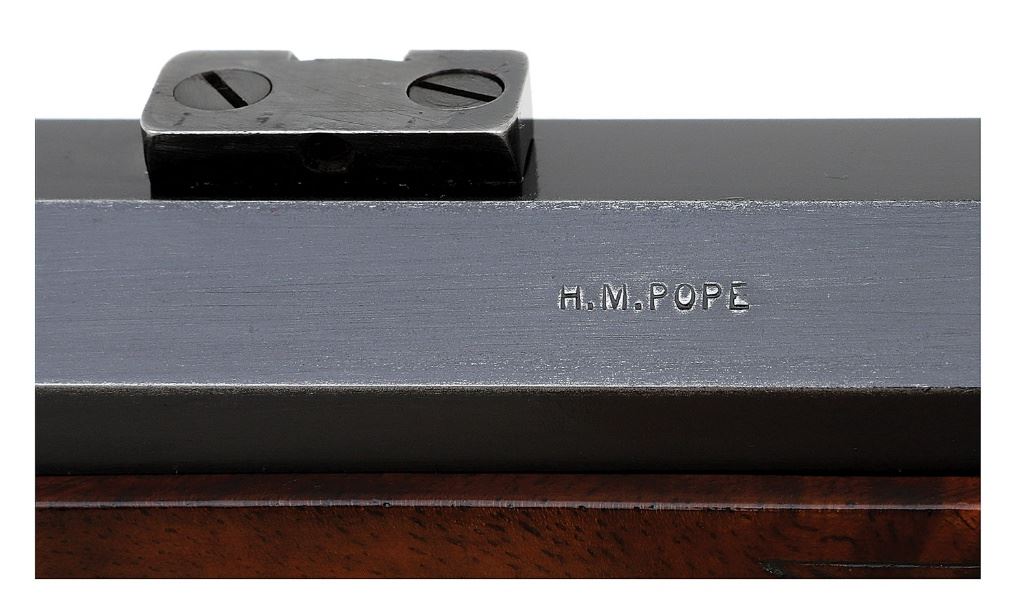 serial #105412, 33-40, 32 1/2" octagon No. 4 weight Stevens-Pope barrel with an excellent bore. This barrel was originally Stevens-Pope #1703? (the number is struck through and hard to read) and was then rebored at Jersey City and is JC #746 on both the bottom of the barrel and on the included original false muzzle. In addition to the barrel, other custom features include an iron Pope finger loop lever and a Pope windage adjustable tang mounted peepsight. The rifle remains in very nice condition with the barrel retaining 97% original blue finish overall with light silvering along the high edges. The barrel has an extra dovetail just ahead of forend tip along with a pair of scope blocks. The barrel bears the standard "STEVENS-POPE" address along with "H.M. POPE" from the time of the Jersey City re-rifling. The action retains 97% plus original blue finish overall while the hammer and lever retain strong original Winchester color case-hardened finish. The Pope lever retains about 50% original Stevens color case-hardened finish. The factory checkered pistolgrip Schuetzen buttstock and forend are of highly figured walnut and rate excellent with 95% original finish remaining and with sharp checkering. The buttstock assembly number does not match the tang however the original Helm buttplate, with matching assembly number is affixed to the stock. The forend is fitted with a factory tuning fork palm rest with checkering cut around the base. The rifle letters as a 30" octagon No. 3, 32-40, Schuetzen set, checkered stock, pistolgrip, mid range Vernier peep & windgauge front, no rear seat, spur finger lever, palm rest, Schuetzen cheekpiece, Helm buttplate, received and shipped on 12/13/07. Oddly with that configuration the sheet lists the gun as a "musket". In addition to the globe target front and Pope tang sight, the rifle is equipped with a Winchester A5 telescopic sight which has slightly cloudy optics. The rifle comes with a nice period wooden shooters kit which includes a Jersey City Pope Universal mould, Pope grease pump, Pope duplex powder measure, unmarked brass starter, mountable re-decapper, barrel rest, primers, cases, cast bullets, 2 powder cans, a small memo pad of shooting notes, and a letter from Sam Clark of Waterville, Maine to Ray Smith of Selinsgrove, PA. Dr. Davis' notes state that this rifle had belonged to Sam Clark, Jr. of Waterville, Maine who was an early 20th century target shooter, collector and personal friend of Harry Pope. Clark was a contributor to books and articles on shooting from the 1930s and was also friends with Lucian Cary, Ned Roberts and Harvey Donaldson. Dr. Davis lists the rifle's provenance as Sam Clark, Jr., Al Marciante, Gary Quinlan, Bill Winfield and Warren Greatbatch. A very handsome and fine custom Pope High Wall rifle with excellent provenance. (1F11511-19) {C&R} [Dr. Robert Davis Collection] (12,000/18,000)