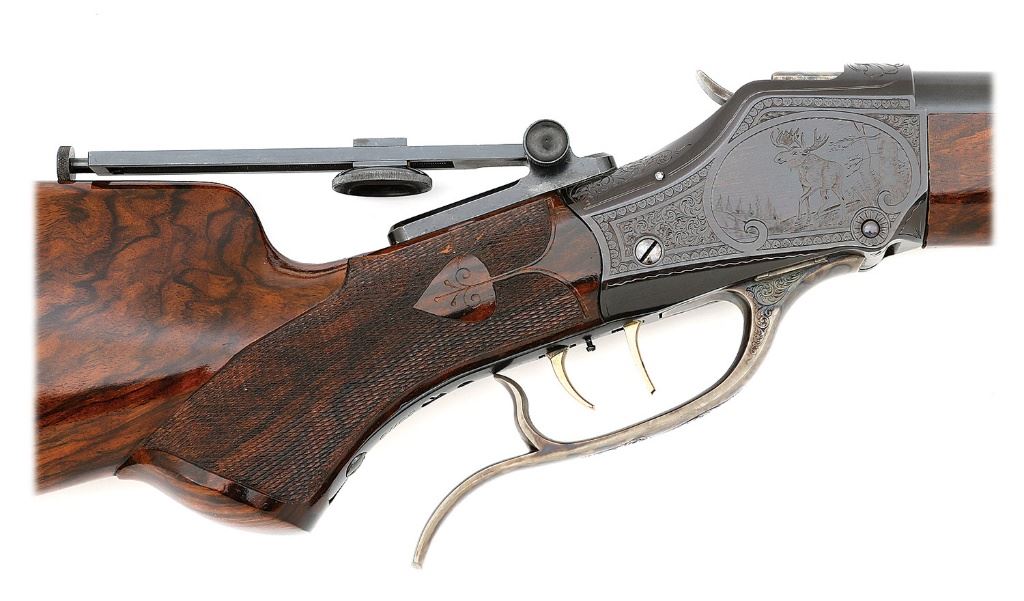 serial #50110, 50-110 WCF, 28 1/2” round barrel with a bright near excellent bore. This lovely rifle is equipped with a non-factory barrel marked only with the cartridge designation on the shank that appears to be equivalent to a No. 4 weight or so. The rifle has been finely embellished in factory style by James Lowe, a Virginia engraver who worked for Tiffany and as a freelance engraver, the inside left upper tang signed “J LOWE 2020”. The barrel retains about 98% fine quality original rust blue showing a few subtle handling marks while the action retains a similar amount of nicely restored polished bright blue showing a few areas of plum-brown discoloration under bright light. The triggers show nice gold wash while the hammer, breechblock and lever retain 98% lovely vibrant case-hardened colors, the top surface of the breechblock with some light flaking to gray. The action is engraved with lovely detailed embellishments featuring small heart borders, tight detailed foliate scrollwork, wide acanthus motif on top and game scenes on either side encircled by a wide flourish. The right side features a bull moose and the left a very noble-looking stag. The serial number along the lower tang was very neatly re-engraved; it seems to be the case this was likely the original serial number and the more modern 50 caliber barrel was installed to conveniently “match” the serial number with its chambering. The fleur-de-lis checkered capped pistolgrip deluxe walnut buttstock and schnabel forend with ebony tip insert are excellent quality replacements in very fine condition, the buttstock with some light scuffs and small dings along the comb line and right-side grip checkering and the forend with a few small repairs ahead of the screw which are unobtrusive. The wood exhibits lovely grain figure throughout and the stock features a nice left-side shadowline cheekpiece and checkered steel buttplate. The rifle is sighted with an unmarked Vernier-style long rang tang sight, Winchester express rear sight and a combination front sight in the style of Lyman’s No. 5. The action with double set triggers seems to function well mechanically. The rifle comes cased with accessories in a fine Huey leather-covered oak case serial #544. The exterior rates very good plus having seen a bit of honest use with scattered scuffs, a few areas of discoloration and one area of more moderate abrasions along the right corner. The interior is lined in green suede and rates very fine, there are three lidded compartments and the case contains a full complement of accessories including: an original plastic-wrapped vintage box of Winchester primed shells with green lid label in very fine condition, original Winchester hand-reloading tool, original Winchester single cavity bullet mould in near excellent condition, brass oil bottle, and a set of ebony-handled tools (turnscrew, brush and cleaning rod with attachments). This is a lovely and interesting cased ensemble for the Winchester or single shot collector. (13D11576-1) {ANTIQUE} (6000/8000)