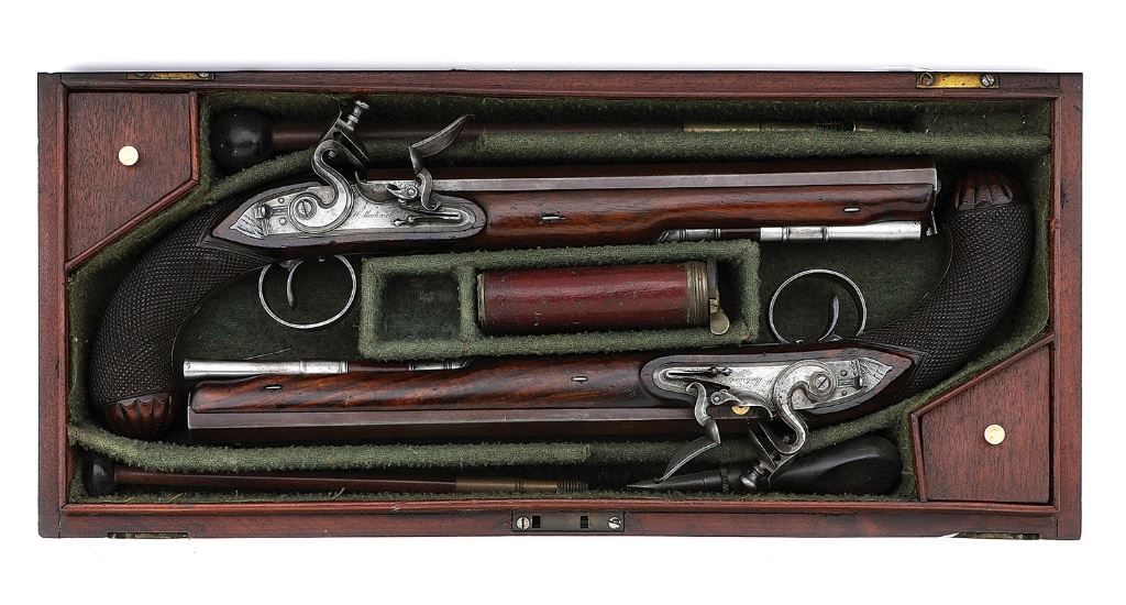 Lot 190 Handsome Cased Pair Of British Flintlock Dueling Pistols by Mortimer