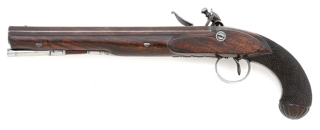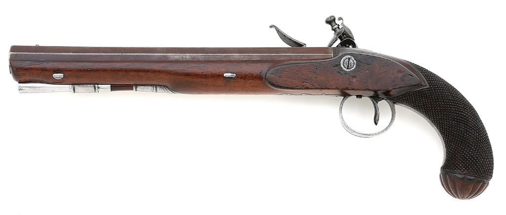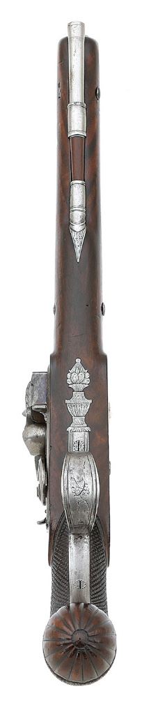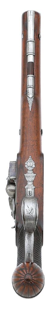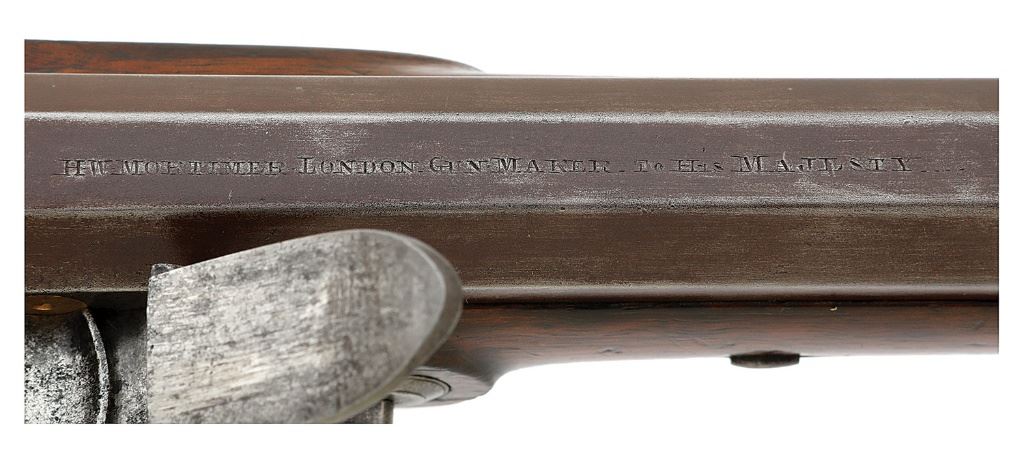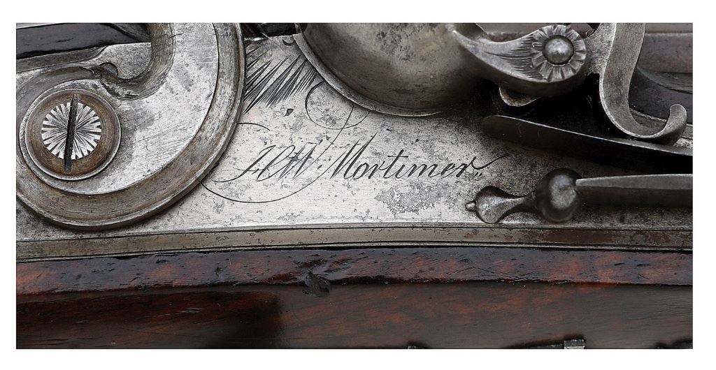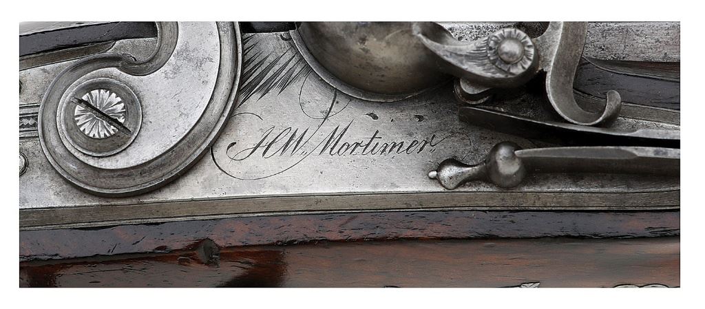 26 Bore (.56 cal), 10'' smoothbore octagon barrels with slightly swamped muzzles and mostly bright very good bores showing a few small areas of pinprick pitting and light oxidation. The barrels of this fine set of pistols retain perhaps 80% of an antique plum-brown finish that is thinning to a pleasant deep gray patina along with some sparsely scattered pinprick pits. The barrel flats retain nice markings showing ''H.W. MORTIMER-LONDON. GUN-MAKER. TO HIS MAJESTY…'' and there are fine gold vent liners present. The locks feature later-style amenities throughout with stepped teat at rears, sliding safeties, bridled roller frizzens, waterproof pans and graceful swan-neck cocks, the neck of one showing a very old and well-executed repair. The locks have mostly toned to a pleasant smooth silver gray case-hardened patina with maker's name in fine script and some sparse tasteful embellishments. The frizzen springs retain a hint of fire blue, the barrels are secured with a pair of wedges without escutcheons and all hardware is iron consisting of ramrod thimble, tailpipe, attractive round triggerguard, and finely detailed pineapple and urn finial. There are stand of arms along the bows of the guards and the walnut stocks are very fine featuring robust square checkering and radiating flutes at the pommels. The stocks show a few repaired thin drying cracks, some scattered dings and lightly chipped points, otherwise maintaining a nice honest appearance overall and some areas of subtle attractive grain figure. Equipped with a set of heavy iron-tipped ramrods and sighted with deep notch rear sights and small silver bead front sights, the locks also feature adjustable set triggers. One lock will require some mechanical attention as it does not hold at full cock and the other functions crisply. The pistols includes a very fine antique case with brass lid handle and clasps showing some light dings and scuffs along the exterior. The interior is lined in green baize that shows some evident pilling and fading, likely an older relining, and there are two lidded compartments and a reproduction Mortimer label. The case contains a pair of ebony-handled mahogany shank cleaning rods, a few cleaning attachments, ebony handled turnscrew that appears to be a slightly more modern make, a key, and a three-compartment flask missing its spout and its body covered in red Moroccan leather. This is a very fine pair of pistols from a excellent quality and well-regarded London maker. (13E11519-1) {ANTIQUE} (10,000/15,000)