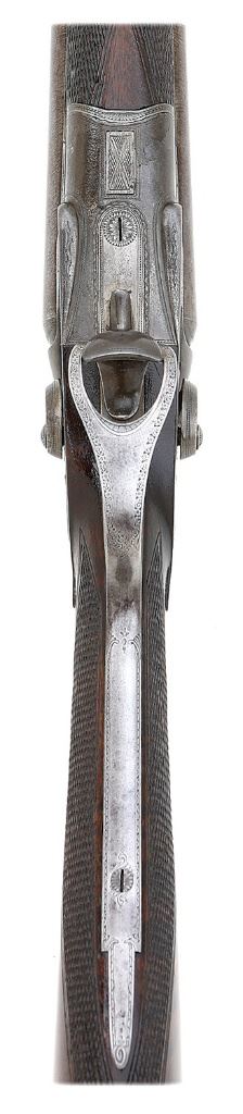 12 ga., 31" barrels with about good bores being mostly bright but having a couple areas of moderate pitting. The barrels are engraved on top of rib "JOHN KRIDER PHILADELPHIA". Each lock shows wonderful rope style border engraving with areas of light tasteful scroll with "JOHN KRIDER" on forward section of each lock. The barrels show a single partial proof and "18.4" on flats which lead us to believe that they are probably Belgian made. The action shows no proofs of any kind and features the thumb break action used by Purdey with pivoting lever in the front bow of the triggerguard. The barrels show an even mix of original brown finish and a gray brown patina with strong damascus pattern their entire length. The action and locks show about 75% faded original color case-hardened finish blending with a smooth gray brown patina where finish is missing. The locks are very crisp and function properly. The checkered straight grip buttstock and forend are of beautifully figured fiddleback crotch walnut and rate excellent with crisp edges, nice dropper points and sharp checkering. The forend is short measuring only 6" in length and the stocks show about 95% original oil finish. The smooth steel shotgun buttplate is cleaned to a light gray patina and provides a 14 1/4" length of pull. The gun remains tight and on-face. The quality of Krider's work is legendary and this shotgun exudes that craftsmanship. (1D11739-116) {ANTIQUE} (2000/4000)