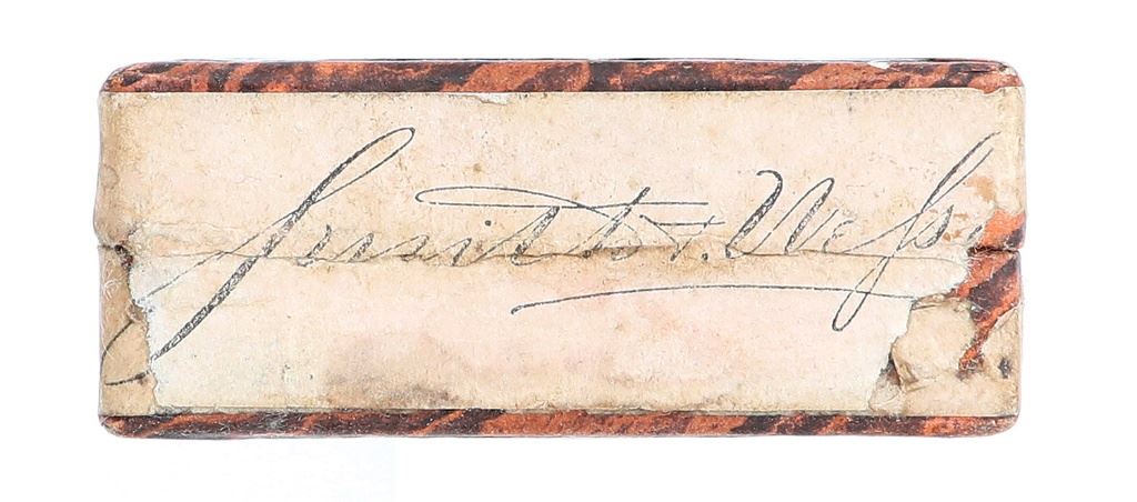 This is an excellent little box for No. 1 (22 Short) cartridges featuring the metallic blue label with gold embossed information, this variant without images of the revolver or cartridges. The label is lovely showing a little subtle staining and some mild wrinkling while the embossed lettering remains almost entirely intact having taken on a nice mellow patina. The label shows single 1860 patent date and pointing hand ''NB'' notification. The box proper is fine marbled red and black paper-covered with buff end stickers showing Smith & Wesson signature, these show some light flaking to be expected, but are otherwise quite nice, one side still mostly uncut. The interior is blue paper and has a nicely made wooden block inside. A lovely example. (13C10826-791-3) [Dr. W. Lloyd Hudson, Jr. Collection] (2500/3500)