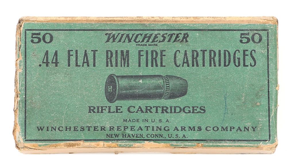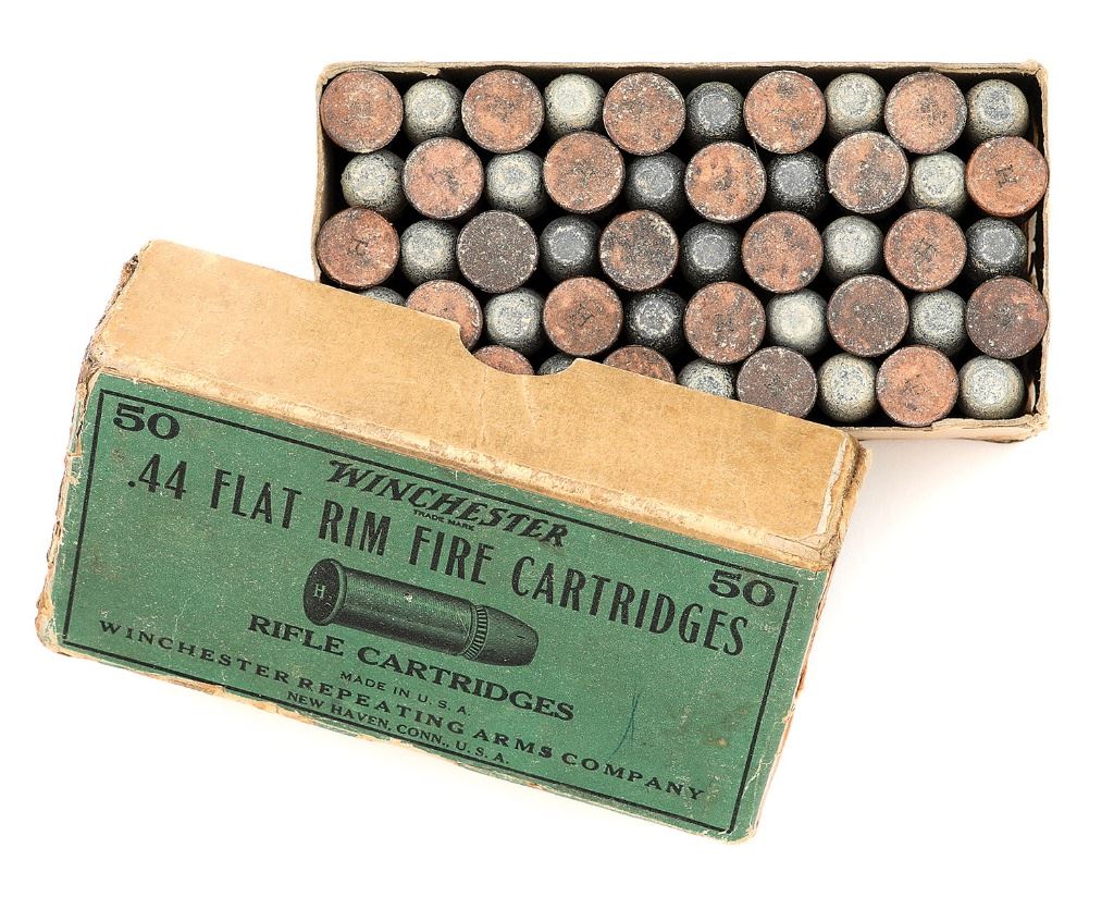 This is a box of 50 Winchester .44 Flat Rimfire cartridges with green label. The box remains in very good condition overall showing lightly worn corners and wear on the edges. The orange end labels remain in very good condition as well showing light scuffing and aged markings. The cartridges appear undisturbed and exhibit even oxidation across. A very fine and highly desirable box of ammunition. (2A11418-1-68) (3000/5000)