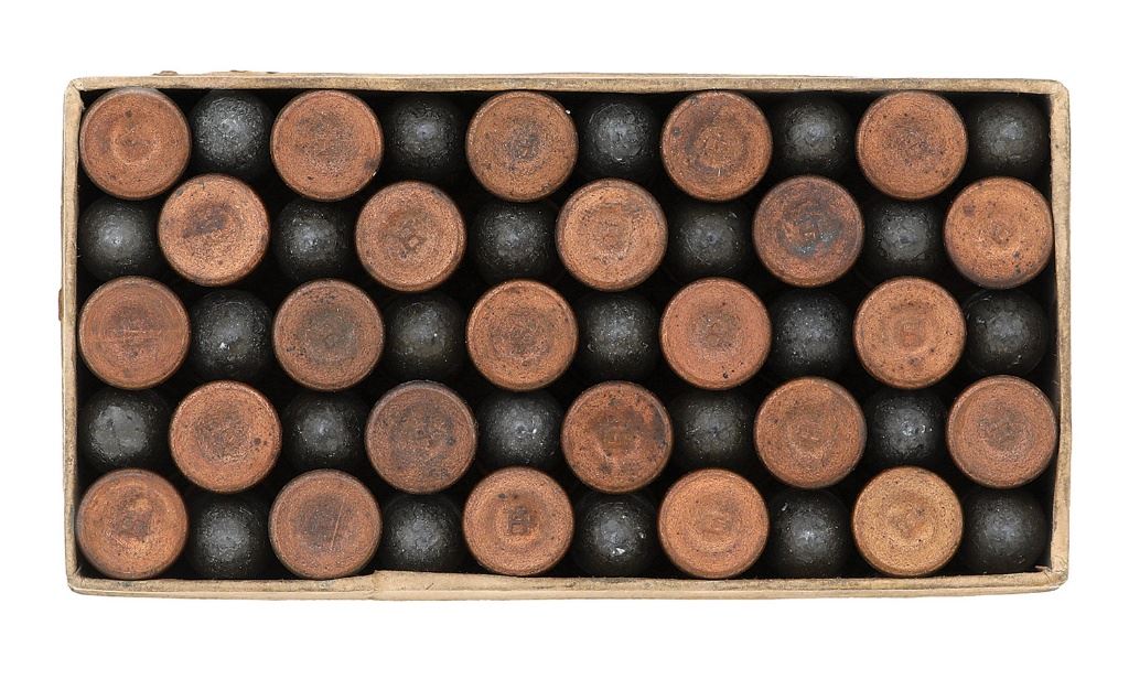 This is a box of 50 Winchester .44 Henry Rimfire Cartridges with green "Straight Border" small label. The box remains in excellent condition showing light age and lightly worn corners. The green top label rates excellent as well remaining 99% complete with light color fading. The cartridges appear undisturbed and exhibit even oxidation across. A very fine and desirable box of ammunition. (2A11418-1-134) (5,000/7,000)