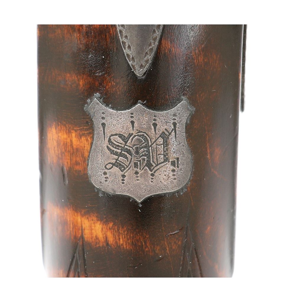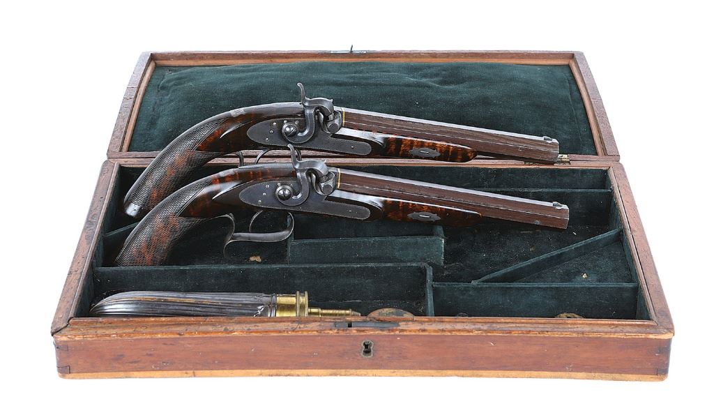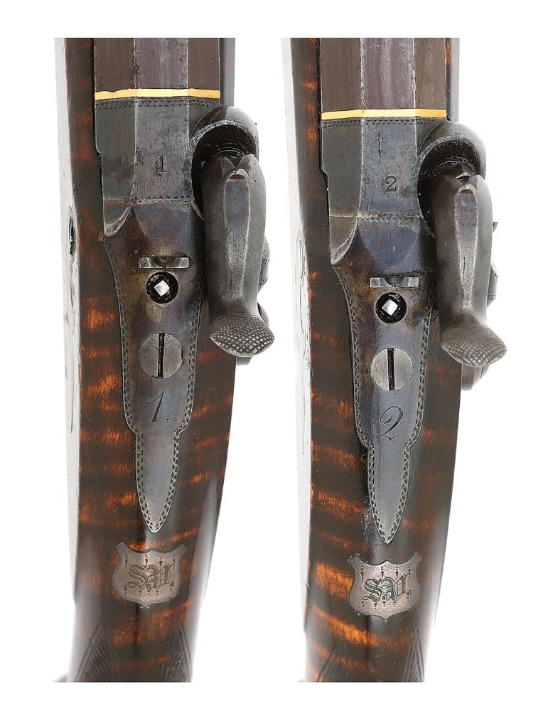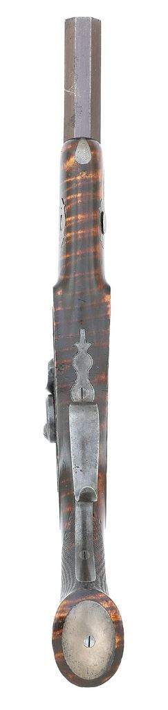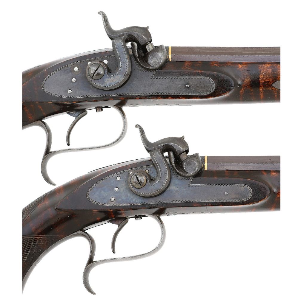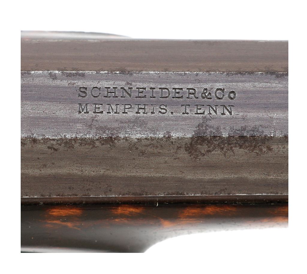 .47 caliber, 8" octagon smoothbore barrels with very good bores. These are an extremely fine quality pair of American pistols. The guns feature very finely made adjustable single set triggers and the locks are finely crafted and action is very crisp. The internals of the lock are finely finished and reminiscent of a British lock. The barrel tangs house key adjustable rear sights which adjust with a square headed screw recessed into the tang immediately to the rear of the sight, this style of sight is commonly found on high quality German target pistols of the period. The guns are stamp numbered "1" and "2" on top of bolsters with hand engraved with the same numbers on the tangs. The underside of the barrel and breech are also stamp numbered "1" and "2". The only other marking on the guns is found neatly stamped on the top of each barrel "SCHNEIDER & CO. / MEMPHIS. TENN". The barrels show gold bands at the junction with the bolster with fine simple border engraving at front and rear of bolster and around the outer edge of the tang. The locks are not marked in any way and also show the same tasteful border. The pistols are stocked in curly maple and feature slightly domed flat butts with large silver oval inlays, a style found on other Tennessee-made guns of the period. The stocks feature iron triggerguards with graceful finger spur, other furniture including the wedge escutcheons, forend tip inlays, sideplates and shield shaped monogram plates on tops of wrists are all of silver. The monogram plates are each engraved with the initials "SV". The fit of the furniture is perfect, the lock screws fit perfectly flush to the sideplates when properly indexed, you cannot even feel the screw head when running your finger over them. The condition of the guns is superb with the barrels showing 95% original brown finish overall with a little light oxidation staining here or there but the finish is very strong and even. The bolsters, tangs and locks show over 90% original color case hardened finish which has softened over time but remains visible throughout and has a lovely antique appearance. The stocks are flat top checkered on their grips and retain 95% of their original finish. The stocks show sharp edges, rich color and just have a wonderful untouched surface. The pistols are sighted with a dovetail mounted fine blade front sight and the previously mentioned German-style elevation adjustable rear sights. The pistols come in their original case which is made with walnut sides and what appear to be butternut top and bottom. This gives the case a nice two-tone contrasting appearance. The case lid is quite warped with the front edge being almost 1" open at one side and 1/2" at the other when the lid is closed. The case again is untouched with lovely original surface, the interior lined in green baize with two covered compartments and four open compartments. The accessories housed in the case include a nice fluted American Flask & Cap Co. flask, a single cavity bullet mould, two cap tins, a cleaning/ramrod, "T" shaped iron combination tool, ebony handled nipple wrench and two case keys. The sight adjustment key is no longer present. The interior of the case remains in excellent condition. These pistols are illustrated in Wilson's The Peacemakers: Arms and Adventure in the American West. It is in the caption in this publication that identifies the initials "SV" as being those of Samuel Vance. The Vance's were a prominent family in Memphis with Samuel's father, Samuel Vance, III (1784-1823) owning a chain of mercantile stores and a line of small steamboats used to supply his stores. Samuel Vance was born around 1823. There is little written about him but he was indeed a Captain in Co. F of the 2nd Tennessee Infantry being commissioned on May 1, 1861. He died in 1868 of consumption in Memphis. There is speculation in some references including ''The Deringer in America'' that Schneider was a retailer and did not actually manufacture the firearms that he sold, rather many were purchased from John Mullin of New York City. Judging from the quality of these pistols, which will stand up to any Philadelphia or New York made gun of the period, this could very well be true. Whether made in New York, Philadelphia or Memphis, they are as American as apple pie, not highly embellished but of the finest quality of the period and remaining in superb all original condition. Only one other set of belt size pistols by Schneider are known, they bear the same markings, adjustable sights and furniture but are stocked in walnut. They also have slightly different lockplates and lock screws. These are simply a fabulous set of American percussion pistols which would be right at home in the finest and most advanced collection of American arms. (1H11739-103) {ANTIQUE} [Former Frank Berry Collection] (10,000/20,000)