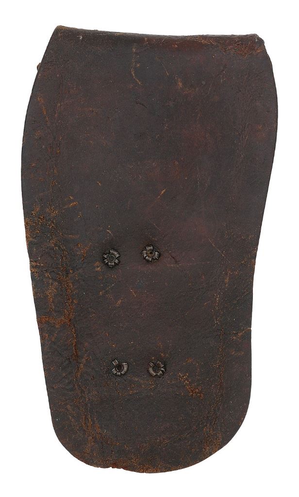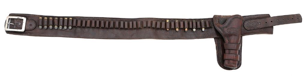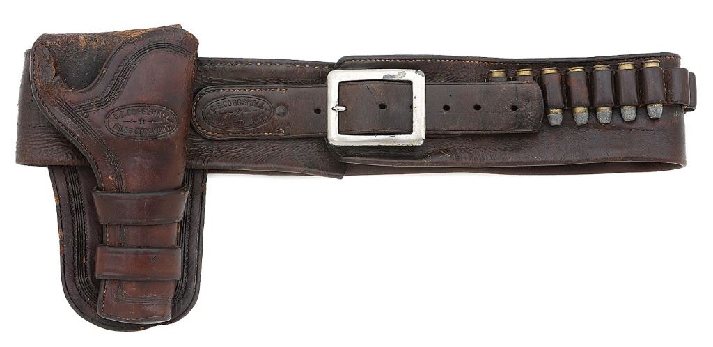 This Mexican loop style holster fits a 4 3/4" Colt Single Action revolver and remains in very nice condition. The holster shows simple tooled border with bold and clear maker marking "C.E. COGGSHALL / (five pointed star) / MILES CITY. MONT.", the same marking appears on the billet. The belt measures 3" wide with a 1 1/2" money slot beneath the buckle, the opposite end of the belt had its stitching neatly removed during the period of use giving access to that end as well. The leather belt remains quite supple measuring 45" overall to end of billet with cartridge loops its entire length. The holster is in very good condition with a nice surface and with a small tear in the edge of the leather where the triggerguard enters and there is also wear where the hammer makes contact. There is no retaining strap and it doesn't appear that there ever was one. These late 19th century Montana made gun rigs are extremely rare and highly sought after. A great opportunity for the American Frontier collector to add a wonderful money belt rig to their collection. (1C11523-138) [Jim Thrash Collection] (7000/9000)