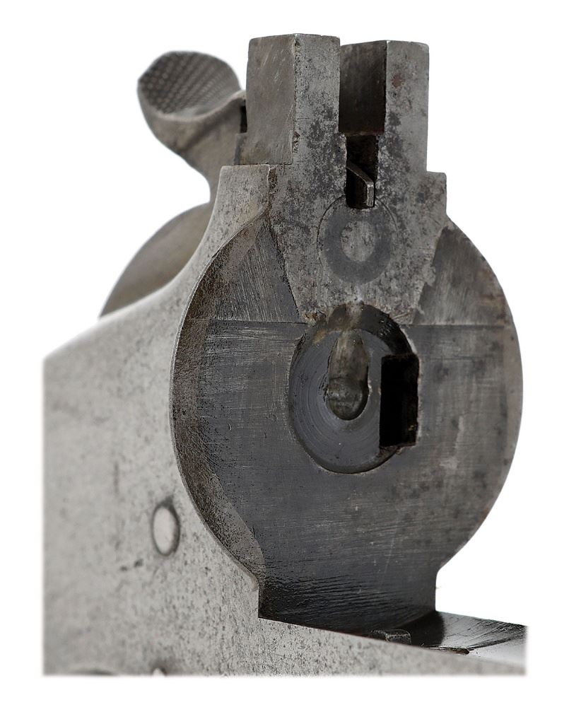 serial #51476, 44 Henry RF, 7'' barrel with a partially bright about very good bore showing light pitting and darkness in the grooves with otherwise strong rifling. In 1877 Turkey ordered another batch of 7,000 revolvers chambered in 44 Henry RF but by this point Smith & Wesson was essentially starting to discontinue the rimfire offering. Centerfire frames had to be modified with a plug and the factory only had 2000 cylinders on hand to fulfill the order. Normally this contract has a small ''W'' inspector stamp on the butt, this example has a small illegible stamp that does not appear to be a ''W'' though the inside of the frame on the right side beneath the grip does bear a Turkish numeral ''3'' stamp, indicating it was no doubt part of the Turkish contract. The metal surfaces have mostly toned to a mild gunmetal gray patina showing scattered old pinprick pitting and remnants of oxidation staining. The single line barrel address and patent date markings are otherwise intact and strong and the smooth walnut grips remain in about good condition having darkened from the years showing scattered old dings. The right panel is properly stamp-numbered matching the frame by serial number, the number on the latch is no longer visible and the barrel and cylinder are matching the frame by assembly number. Barrel-to-frame fit exhibits a hint of minor play and the action otherwise seems to function well mechanically. A very good example of a rare contract revolver. (13B10826-293) {ANTIQUE} [Dr. W. Lloyd Hudson, Jr. Collection] (1500/2000)