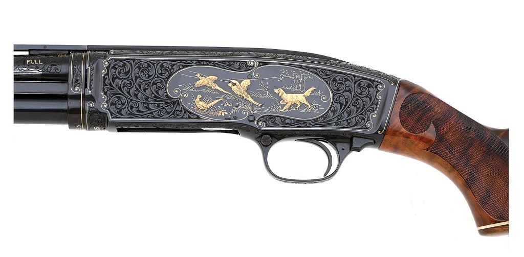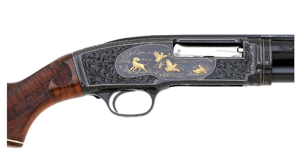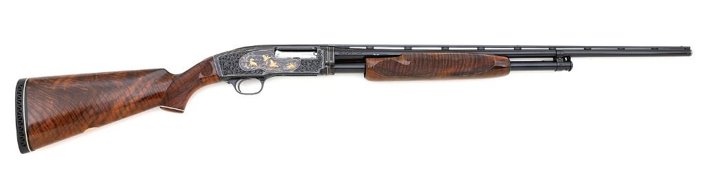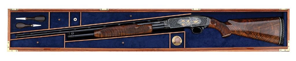 Lot 238 Exceptional Angelo Bee Engraved & Gold Inlaid Winchester Model 42 Shotgun with Wonderful Huey Case