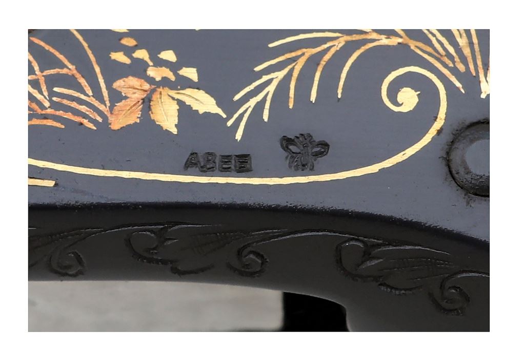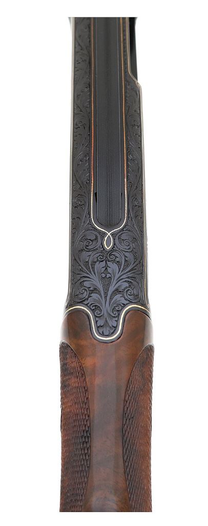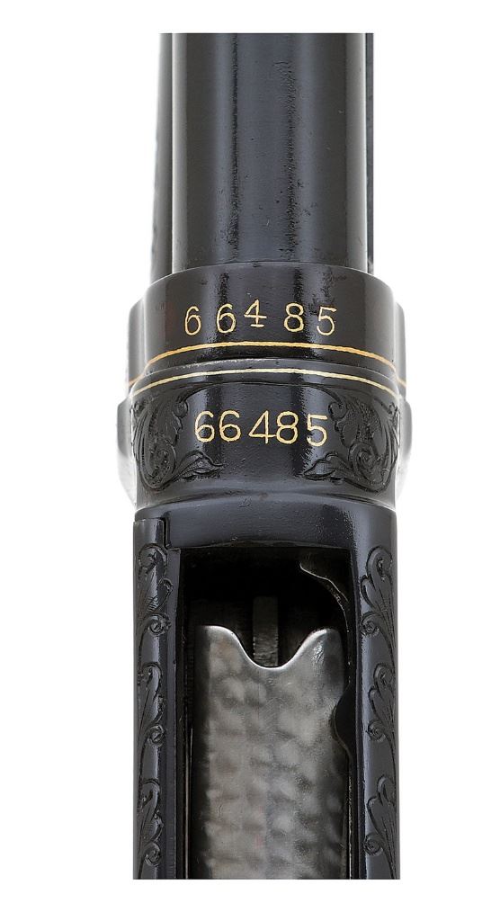 serial #66485, 410 bore (3”), 26” ventilated rib barrel choked improved cylinder (marked full) with a bright excellent bore. This wonderful 1948-made shotgun has been beautifully appointed by master engraver Angelo Bee, the action embellished in full coverage with excellent detailed flowing foliate scrollwork and stippled background shading further accented by very fine gold wire inlay throughout. There are beautiful full gold inlays left and right consisting of very finely detailed game dogs and birds, the left side signed with small “ABEE” and bee symbol. Lighter foliate flourishes and gold line inlays extend along the barrel breech, magazine hanger and muzzle with the proof marks and serial numbers also gold-inlaid. The metal surfaces retain about 98% fine quality post-engraving restored blue showing just a little mild silvering along the barrel and a few sparse tiny speckles that are hardly worth the mention. The bolt and shell lifter are mostly bright and show fine engine turning and all embellishments are crisp. The gun has been professionally restocked in an excellent grade of walnut featuring checkered forend, capped pistolgrip buttstock and a semi-gloss varnish in excellent condition showing just a few tiny dings and minor handling marks on the left side of the buttstock. There is an ivory line spacer above the rosewood pistolgrip cap and the wood exhibits stunning exhibition-quality grain figure throughout. The toe line features an un-engraved gold monogram plate and length-of-pull to the ventilated black rubber Pachmayr pad is 14 1/4”. The arm is sighted with a small white mid-bead and larger silver bead front. The Huey case is serial-numbered “257” and is of fine leather-covered oak construction with zippered and padded green canvas leather trim over-cover. The case shows just some mild edge wear along the exterior and the interior is lined in fine blue suede and fitted for the shotgun. There are four lidded compartments and the case contains a key, brass oiler, two-piece rosewood cleaning rod with attachments, one nickel-plated snap cap and a pair of fine rosewood-handled turn screws. Mr. Bee is sadly no longer with us and his work only continues to garner interest among those who appreciate his fine work and prolific career. An excellent opportunity to acquire one such very fine example of his art with the added bonus of a superb case from one of the finest case-makers in the business. (13G11712-11) {C&R} (12,000/18,000)