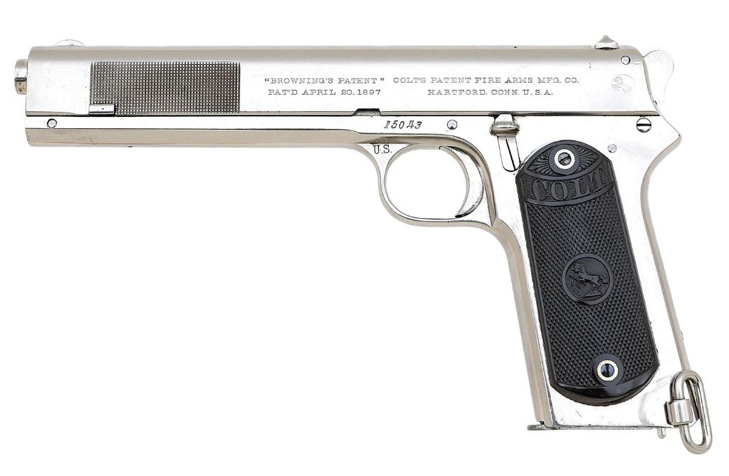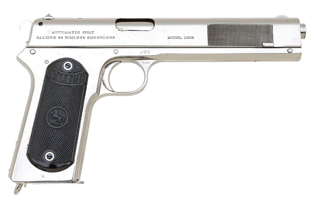 serial #15043, 38 ACP, 6'' barrel with a partially bright very good bore showing some fine pinprick pitting and oxidation in the grooves with otherwise strong rifling throughout. This attractive 1902-made pistol is indeed the 42nd Model 1902 pistol made and was one of 200 purchased by the U.S. Government for military testing, featuring the early rounded hammer and fine checkering along the forward portions of the slide. The pistol has been expertly refinished in nickel, no doubt long ago, and very much looks like factory quality nickel. Bannerman received many of these pistols for resale and there is a very good chance this pistol was refinished for Bannerman's sales. The metal surfaces retain 98% of the aforementioned nickel finish showing a few sparsely scattered tiny flakes, a couple small dings and light handling marks. There are some sparse remnants of very fine pinprick pitting beneath the finish that is very unobtrusive and the finish is starting to reacquire some honest subtle clouding in areas. All markings remain completely intact and strong, actually quite crisp, and are completely unmolested from the refinishing with even the Rampant Colt at the rear left-side of slide very strong. The gun shows proper ''U.S.'' property mark on the left side of the triggerguard and the right side of frame with ''J.T.T.'' and ''R.A.C.'' inspector initials. The interior of the slide is also properly matching the frame and shows ''R.A.C.'' on the inside. The black checkered hard rubber grips remain in excellent condition showing just some scattered light handling marks and crisp Rampant Colts. The grip screws retain generous brilliant fire blue as well, and the lanyard ring is intact. An original magazine with crisp 1884 patent date on the floorplate and retaining 95% nickel finish is included. The included photocopy of a factory letter indicates the pistol shipped on July 15, 1902 to Springfield Armory in a 100-gun shipment. A very fine and interesting example of these desirable martial Colts. (13B11775-1) {C&R} (4000/6000)