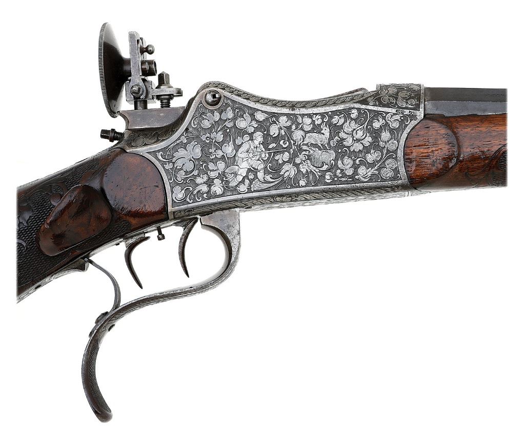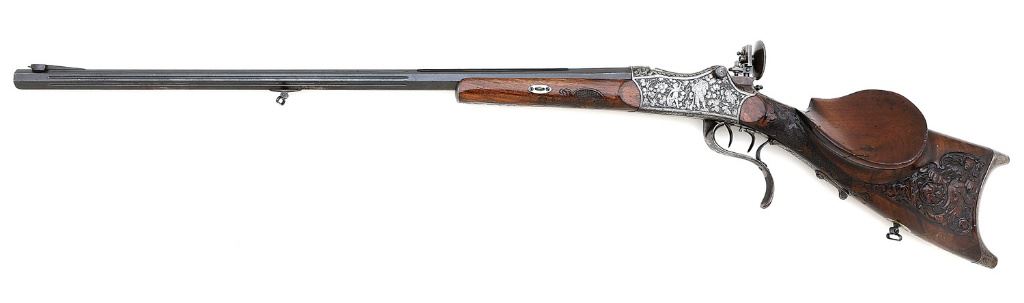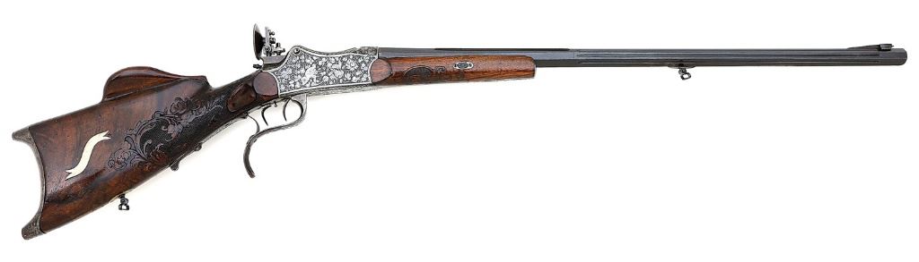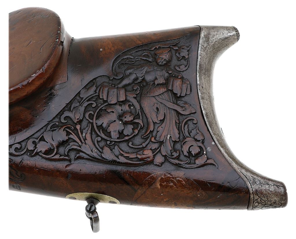 serial #5371, 8.15x46R, 30'' fluted octagon barrel with a bright near excellent bore showing a little subtle frosting and strong three-groove rifling. The barrel retains about 80% original blue with scattered edge wear, toning to gray-brown patina under bright light and mild oxidation staining. The barrel is grooved for rear sights and shows Otto Bennewitz Kaiserslautern retailer marking. The action has mostly toned to a pleasant silvery case-hardened patina showing some scattered light oxidation staining and speckling with otherwise good smoky case-hardened colors lurking about the protected areas. The action is embellished in full coverage with wide Germanic foliate motifs, fine line background shading and foliate borders. The left side scene shows a renaissance rifleman and cupid holding target while the right shows a 19th century rifleman stalking a chamois. The underside of the action shows System Stahl marking and serial number inlaid in silver. The checkered walnut stock and forend remain in about very good plus condition showing some overall dings and handling marks from honest use. The tall left-side cheekpiece appears to have been very neatly grafted on during the period of use and there is a thumb rest on the right side. There is an un-embellished German silver riband set along the right side of the butt and the stocks feature very nice foliate carving and the left side shows a lovely schuetzenliesl with foliate dress integrated into the surrounding motifs. The rifle is equipped with sling swivels and the buttplate has been modified during the period of use, the lower spur shortened. The rifle is equipped with a fully-adjustable tang sight with wide aperture disc. The front sight ramp can accommodate swappable inserts though none are present. The action with double set triggers seems to function well mechanically. A nicely embellished Stahl Martini schuetzen rifle. (13D11108-32) {C&R} [Tom Devers Collection] (2500/4000)