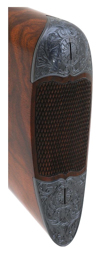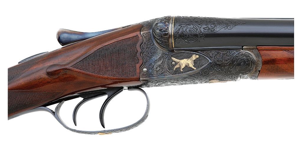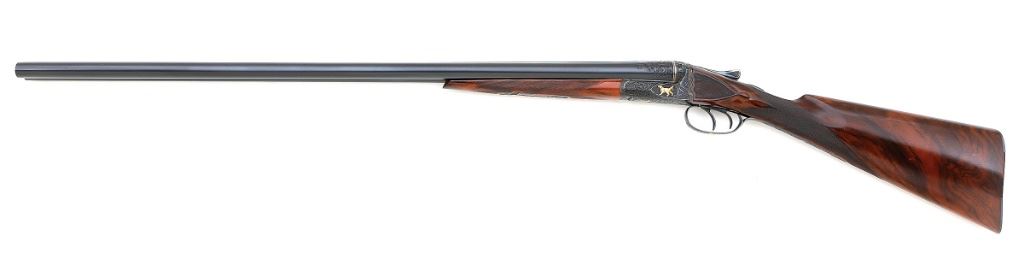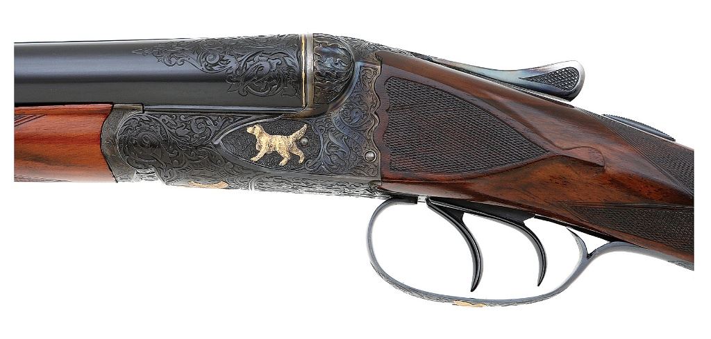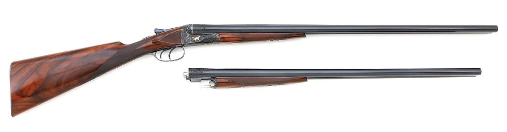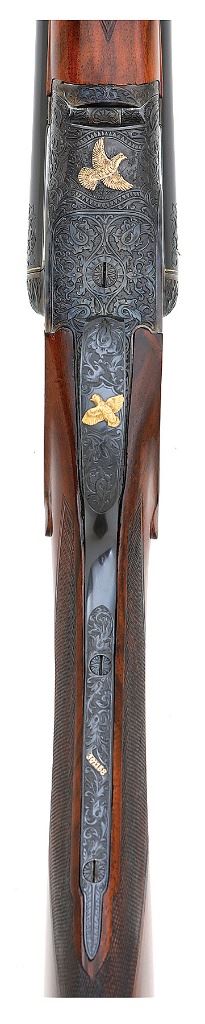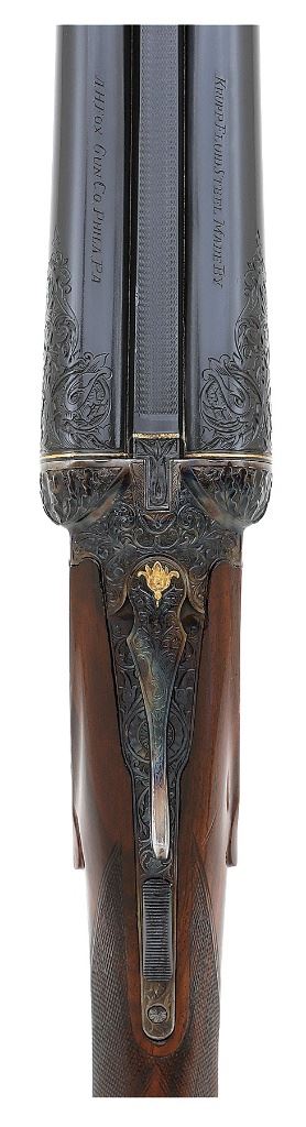 serial #301158, 16 ga., 30'' barrels marked ''1'' beneath serial number on flat and choked improved modified and full and 28'' barrels marked ''2'' beneath serial number on flat and choked modified and improved modified. This is a meticulously executed upgrade featuring deeply chiseled relief scroll with gold inlaid dogs on either side of action and birds in flight on the belly and triggerguard. The engraving is in very full coverage on action with wedges on barrels which also show gold bands at the breeches. The barrels are each marked ''KRUPP FLUID STEEL MADE BY / A.H. FOX GUN CO. PHILA. PA'' both numbered matching to the gun and both engraved on flats ''DE / SPECIAL''. The water table of the action is engine turned and hand engraved with scroll and are also engraved ''DE / SPECIAL''. The action shows deeply chiseled oak leaves on the fences with beautifully executed deep relief acanthus scroll on the balance of the action. The shotgun is stocked with a wonderful piece of English walnut with straight grip, fine checkering and well-defined drop points with checkered cheek panels. The buttplate is a steel toe and heel plate which bears the same flawlessly executed deep relief scroll with beautifuly bordered checkered center panel. The shotgun retains all of its high quality blue finish on barrels, triggerguard and buttplate with the action showing all of its rich color case hardened finish. The shotgun weighs 6 1/2 lbs. with the 30'' tubes and has a 14 5/8'' length of pull with drops of 1 1/2'' and 2 1/2''. While we do not know who the artisan was that upgraded this shotgun, they are a master of their craft. A fine Fox double gun for those who appreciate the finest things. (1G11759-26) {C&R} (15,000/25,000)