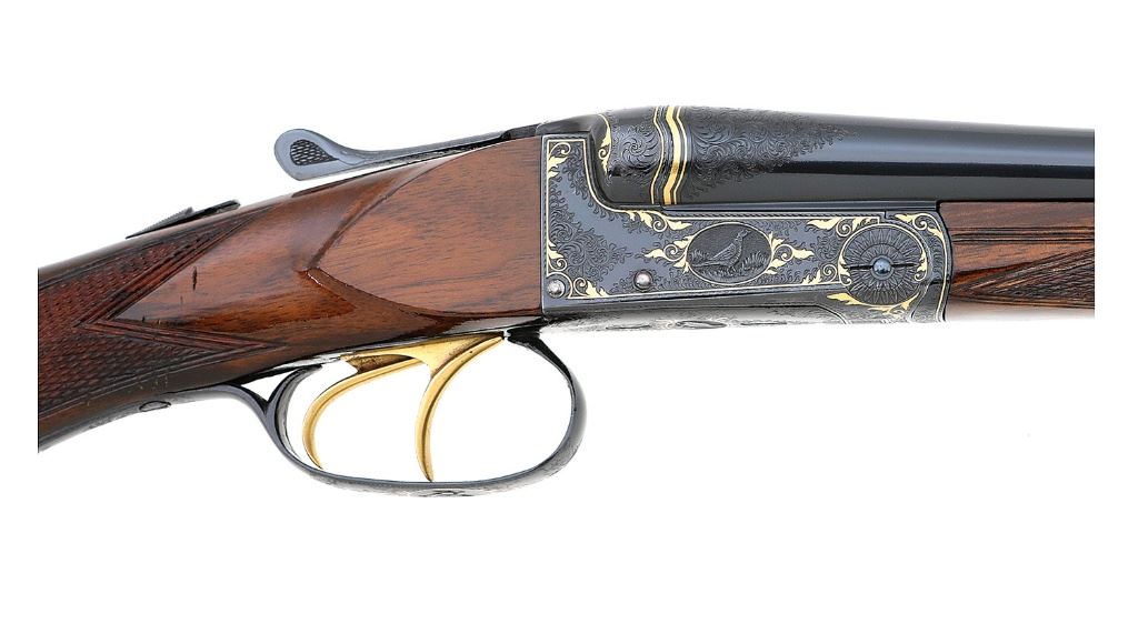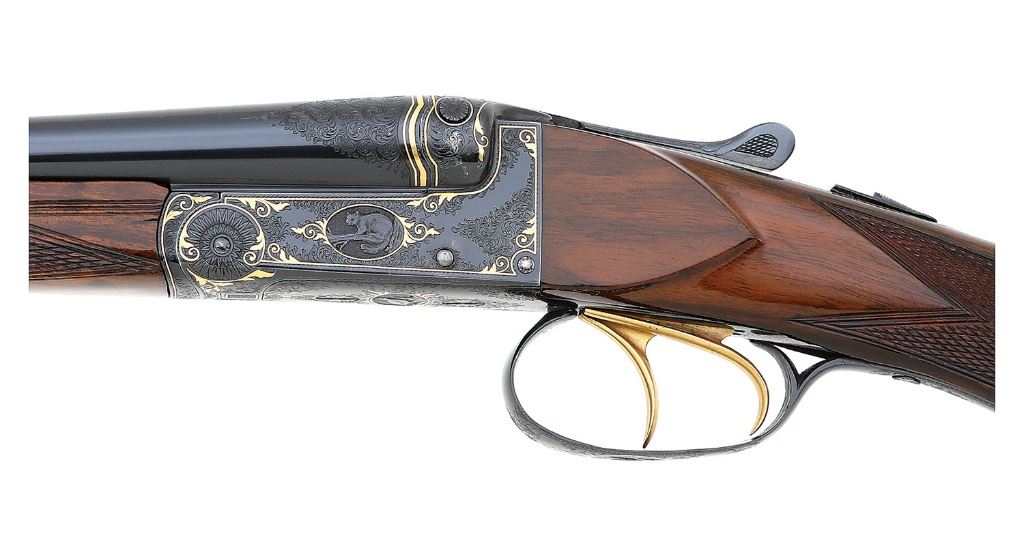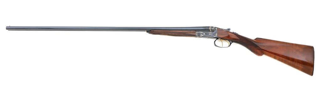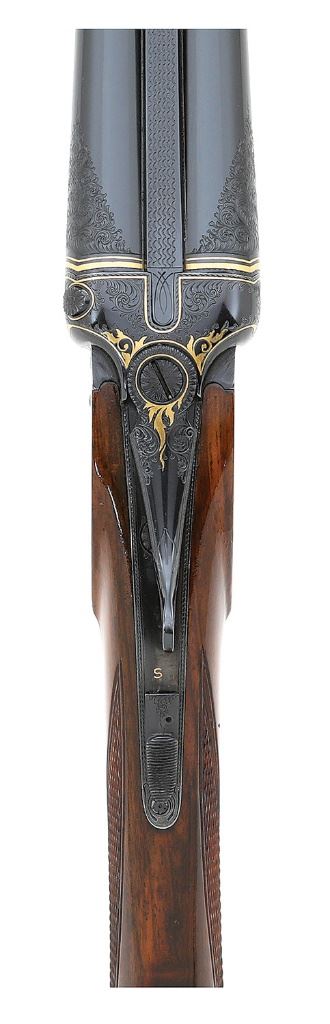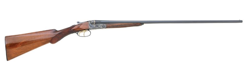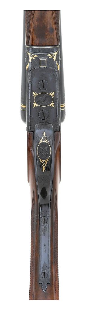 serial #9736, 410 bore (2 3/4''), 27 1/2'' barrels choked cylinder in both with bright near excellent bores. This fine little Belgian guild gun shows ''f'' 1927 date codes on the undersides of the barrels along with standard Belgian smokeless proofs. The metal surfaces retain about 99% excellent quality restored polished blue showing a few tiny handling marks and some areas toning slightly to p l u m under bright light along the action. The barrels are neatly engraved ''A. FRANCOTTE / A LIEGE'', applied after the refinishing, and the undersides of the barrels otherwise do not show the expected ''(Crown) / AF'' stamps found on Francotte guns. The action and barrel breech areas show lovely post-refinishing English style filigree scrollwork throughout with very fine gold inlaid bordering and foliate flourishes. The action also features endearing little detailed vignettes featuring a squirrel on the left, pheasant right, grouse on bottom and woodcock on triggerguard, and the triggers are gold-plated. The checkered round knob pistolgrip walnut buttstock and splinter forend remain in very good plus condition as neatly cleaned and refinished showing a few scratches along the right side of the grip, a small crack at the tip of the forend and a small crack at the heel of the grooved horn buttplate. Length-of-pull is 14'' with drops of 1 5/8'' and 2 3/4'', the stock slightly cast-off. The arm is sighted with a single large brass bead and equipped with double triggers, automatic safety and extractor. The rear trigger is not very crisp but the action otherwise seems to function normally. Lock-up is by dual under-bites with Greener crossbolt and sideclips and is solid on-face with top lever resting about center. Weight is a dainty 4 lbs. 2 oz. and the gun includes a leatherbound case of more modern construction with green velvet interior and reproduction gold-embossed leather Francotte lid label. A wonderful and desirable Belgian 410 double. (13F11523-68) {C&R} [Jim Thrash Collection] (10,000/15,000)
