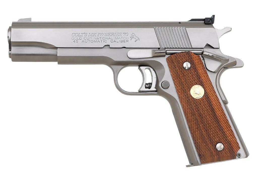 serial #02426N70, 45 ACP, 5'' barrel with a bright excellent bore. This lovely 1981 MK IV / Series '70 pistol is as-new-in-box and remains in superb condition. The metal surfaces retain 99% plus original Coltguard finish (a.k.a. electroless nickel). The checkered walnut factory grips feature gold Rampant Colt medallions and remain in excellent condition. This gun features a nickel finished Patridge front sight, black Colt Eliasson adjustable rear sight, long trigger with overtravel stop, collet bushing, serrated front strap, and serrated flat mainspring housing. It includes the original factory woodgrain box with Styrofoam insert that is correctly end labeled and numbered to the gun, electroless nickel factory marked seven-round magazine, factory bushing wrench, Allen wrench, manual, and paperwork. The box rates good showing light storage wear, a small portion of the box torn on one end, and light tearing on the corners. The paperwork and accessories rates excellent. A beautiful Gold Cup in a rare and desirable finish. (8B11770-11) {MODERN} (3000/5000)