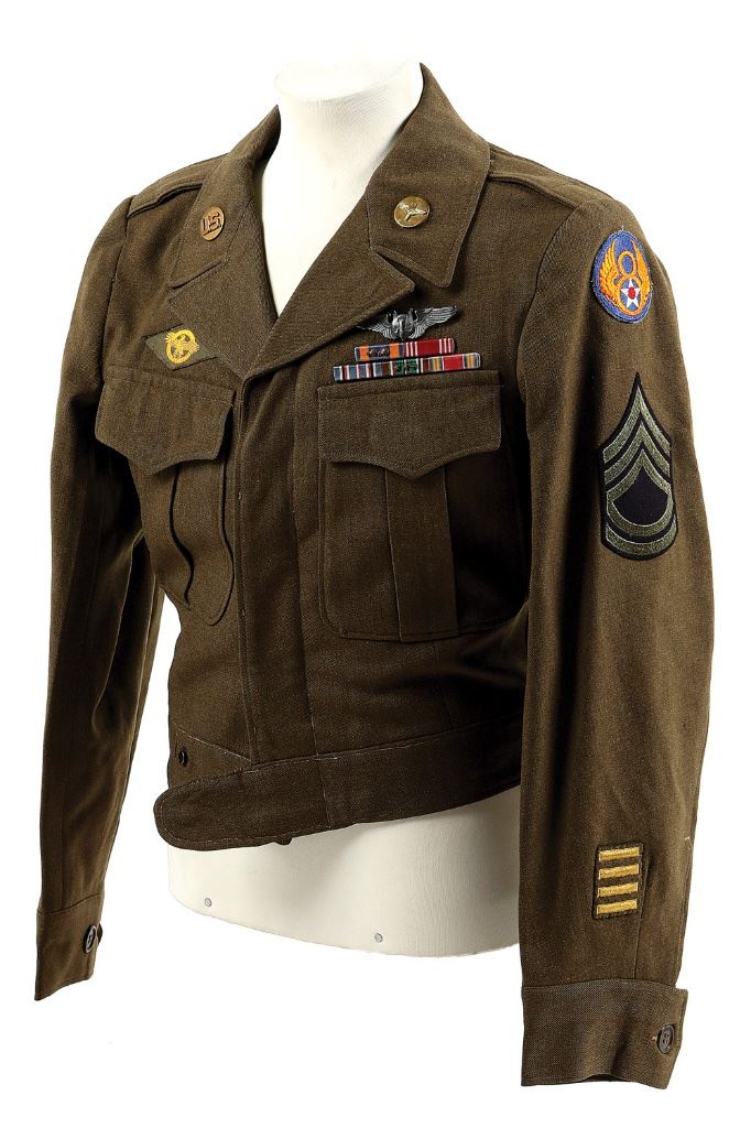 This grouping consists of Talley's Ike-style jacket, two overseas caps, two framed photos of Talley and his flight crew, a pair of leather gunner mittens, traveling suitcase, ''Get That Fighter'' and ''German Phrase Booklets'', B-24 Stationary, 445th unit history book, and documentation on Talley's service in the U.S. Army Air Corps. The Ike-style Class A dress jacket retains the original size ''36R'' collar tag with insignia comprising standard USAAF brass disc collar pins, 8th Army Air Corps unit patch on left shoulder, technical sergeant stripes on each sleeve, four overseas service bars on left cuff, a ruptured duck honorable discharge patch, and awards listed as displayed: Aerial Gunner Wing Badge, Air Medal with two bronze clusters, Good Conduct Medal, American Campaign Medal, European-African-Middle Eastern Medal with 3 bronze battle stars, and WWII Victory Medal. The jacket remains in excellent condition with its only apologies being a few scattered moth nips and snags in the fabric, particularly along the sleeves. The two overseas caps remain in excellent condition with one cap retaining USAAF blue and yellow piping and the other cap plain. The two leather gunner mittens remain in very good plus condition with fine flaking and light handling marks, the wrists displaying a Hansen Glove Corp. manufacturer tag showing ''TYPE A-9A'' and size ''LARGE'' along with ''PROPERTY / AIR FORCES, U.S. ARMY''. The black Smith Corona traveling case measures 13''x13''x5 1/2" and features numerous USAAF colored decals on the exterior top lid with Talley's handwritten name on the latch hinge. The soft cover 445th unit history book and B-24 air mail stationery remain in excellent condition with all 72 sheets of paper and 24 envelopes accounted for. The included binder consists of Talley's unit history, whereabouts, and personal documents including his Separation Qualification Record, enlistment records, Honorable Discharge paperwork, copies of his mission data, and unit accolades. Technical Sergeant Talley served in the 8th Army Air Corps, 445th Bomb Group, 703rd Bomb Squadron from March 1943 until November 1945 flying 23 combat missions initially as an aerial gunner and eventually as a radio operator mechanic gunner. The 445th Bomb Group participated in the European Air Offensive, Normandy, Northern France, Rhineland, Ardennes, and Central Europe. (28D11738-PV12) [John A. Micavich Collection] (2000/4000)