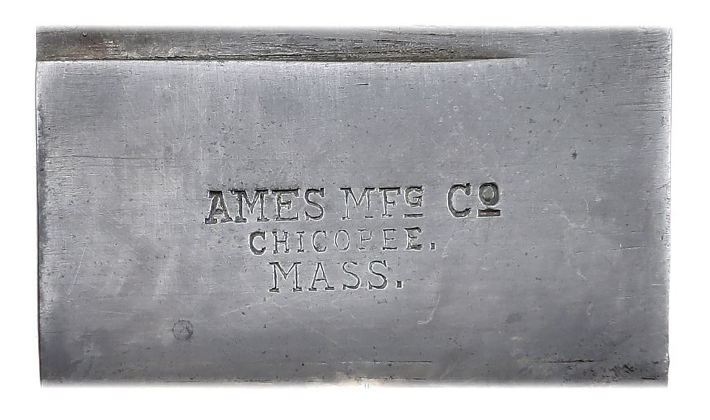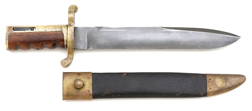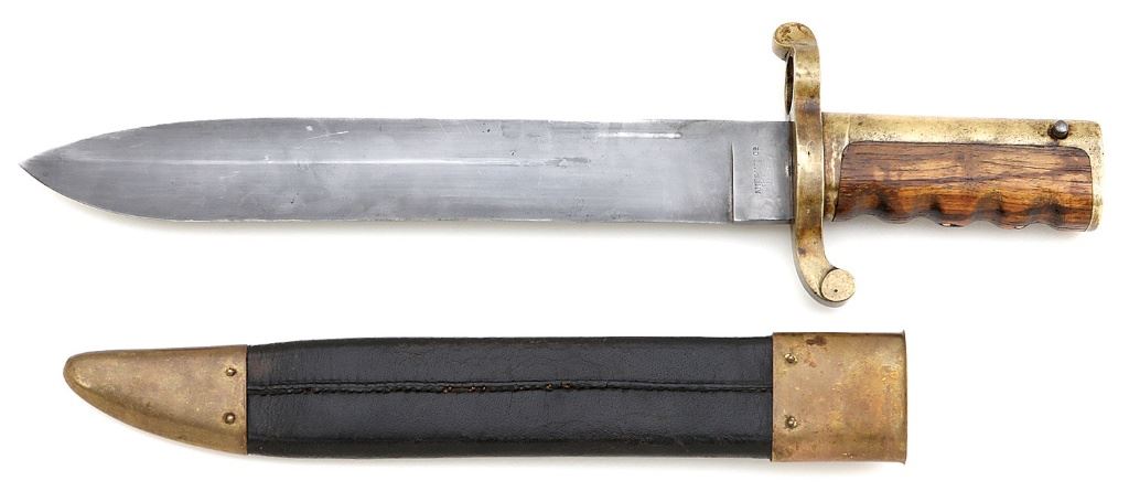 These heavy bayonets were designed by John Dahlgren and made by the Ames Manufacturing Company to replace the long saber bayonets on the Model 1861 Plymouth/Whitneyville rifle-musket, although it's believed Dahlgren's main purpose was a heavy knife for close hand-to-hand combat. This is a first variation with no proof marks, a 1861 date and the grips are fastened to the hilt with three vertical brass pins. This massive bayonet measures 16 3/4'' overall with a 12'' blade equipped with a 6'' reverse swedge. The blade has toned to a pleasing pale gray patina with sparse spots of darker gray, specks of freckling and a couple tiny nicks in the top edge of the tip. The reverse ricasso is marked with a small ''1861'' date while the obverse ricasso is marked ''AMES MFG Co / CHICOPEE. / MASS.''. The hilt consists of a brass S-shape guard with muzzle ring, handle, walnut finger groove grip and a steel press stud and spring. The brass has a tarnished bright ochre with a few tiny nicks and marks expected with age. The grips have an attractive striped grain with light handling marks and a tiny chip at the center retention pin. The press stud is bright pale gray while the spring is a mixture of dark gray and silver with some fine oxidation and hardened oil. The included original plain black leather scabbard with brass mounts remains in good to very good condition with a separating rear seam, light scuffs and crackling. The mounts have a nicely tarnished brass patina with some spots of darker tarnish and staining and all pins remain secure and in place. This is a really nice example of these heavy U.S. Navy bayonets, the early first variations seldomly encountered and highly sought after. (5D11738-EW7) [John A. Micavich Collection] (2000/3000)