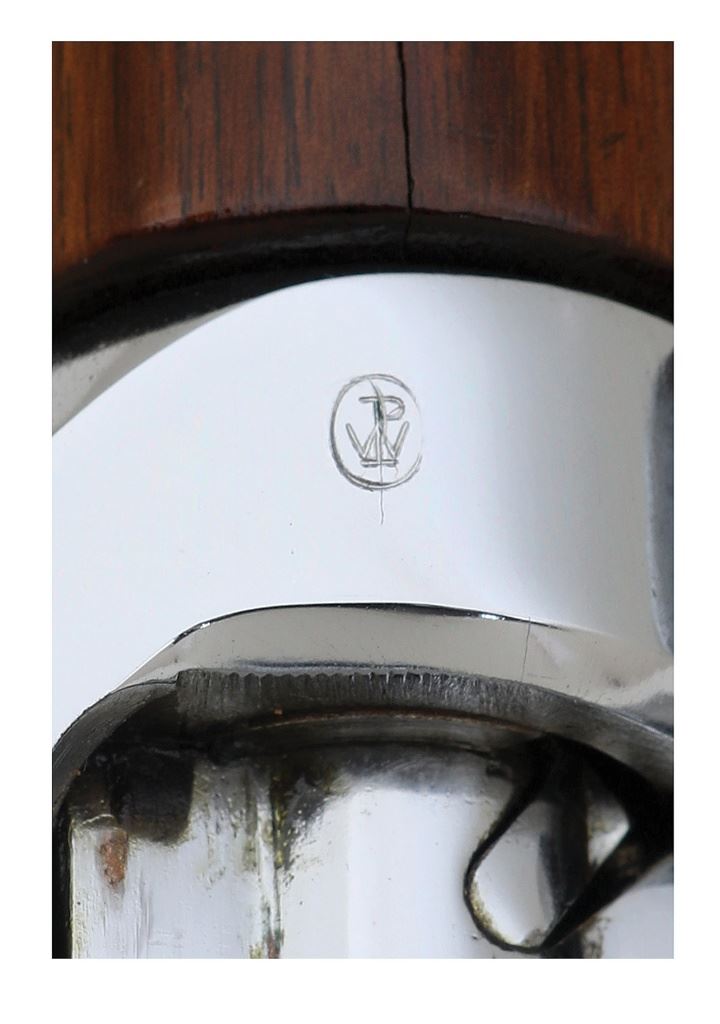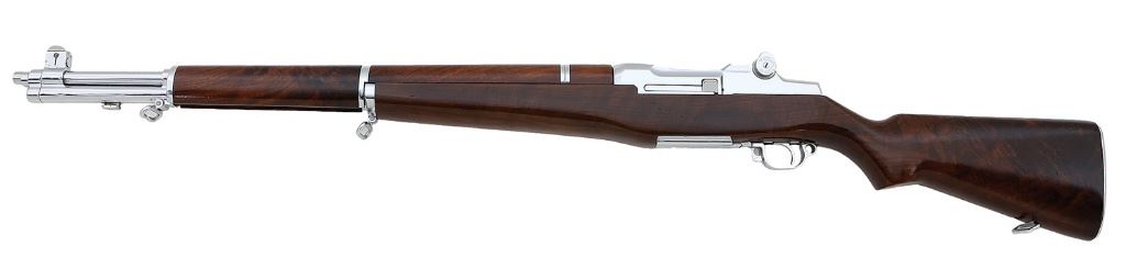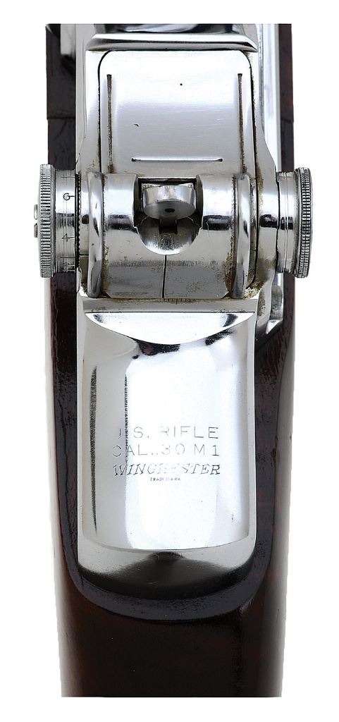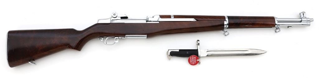30-06, 24'' barrel with a bright excellent bore, the chamber showing a spot of added weld at the 6 o'clock position preventing the chambering of a cartridge. Displayed over the door to the Chief Engineer's office at the Winchester plant, this ''Gauge Gun'' was assembly after WWII using the ''perfect'' gauge parts. The metal surfaces retain 99% original chrome polished to a mirror finish, showing only a few light handling marks primarily on the bolt, and some hints of hardened oil or grease. The deluxe walnut stock is in near excellent condition with some light handling marks scattered throughout, exhibiting beautiful grain figure particularly at the comb and forward handguard and absent are the standard inspection and acceptance marks, as this rifle was never meant for military service, the rear handguard in very good plus condition showing a tight crack at the rear. The butt spots a checkered buttplate without trap, also nicely chromed and showing a spot of light surface oxidation in the middle. The standard receiver markings are intact if just a touch thinned, no serial number is present nor shows evidence of ever having been applied, the area above the chamber stamped with a crisp ''WP'' Winchester proof, and the marked parts show Winchester drawing number appropriate to circa 1941, and the underside of the receiver is marked ''WRA 06''. The rifle retains the standard open sights, the front sight with sealed adjustment screw and typical wide Winchester protective ''wings'' and the rear sight with early flushnut rear sight drums, a milled triggerguard, and early single slot gas cylinder screw. Included is an M1 bayonet, chrome finished like the rifle with which it is paired and showing general light clouding, with a 9 7/8'' spear point single edge blade with a single unstopped fuller which terminates about 2 1/2'' from the tip, and the grips are a grooved black plastic. The ricasso is strongly marked ''U (flaming bomb) S'', above which shows a light marked tall ''W''; careful examination appears to show evidence of a removed maker's mark, atop which the ''W'' was added, likely by those at Winchester to round out their fine display piece. Also included is a red faced circular plastic tag reading ''WINCHESTER / GARAND / GAUGE GUN'', a brass disc attached to the same reading ''995'', and a laminated card displaying the Winchester galloping horse logo on one side and short summary of the rifle's history on the other. A one-of-a-kind Garand display rifle, a fine choice for the advanced collector. (14D11759-40) {C&R} [Former Peter & Patty Murray Collection] (10,000/20,000)