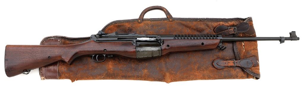 serial #A5103, 30-06, 22'' 41-dated barrel with a bright excellent bore. This is a very attractive rifle retaining about 96% original Parkerized finish showing just a few sparsely scattered small spots of mild oxidation and subtle edge wear, the magazine body with a bit of discoloration that is relatively minor. The bolt body is mostly bright showing one area of gray-brown oxidation staining and all markings remain intact and crisp, the right rear receiver with Cranston Arms stamp and small inspection star. The smooth pistolgrip walnut buttstock and forend remain in near excellent condition retaining most of their original oil finish and showing just a few small shallow flakes missing along some edges and other light handling marks and the left side of the forend exhibiting a hint of subtle attractive grain figure. The barrel and bolt show mismatched numbers from the receiver as-is correct, the rifle is equipped with a meter rear sight and the action seems to function well mechanically also with functional bolt hold-open. Also included is a period leather case with fur lining by Red Head, that appears to be specifically for a Johnson rifle with production code ''269J'' on one of the straps. The case rates fair-good showing honest wear with scattered small tears, scuffs and overall flaking and the closure flap straps have detached but are present, their corresponding buckle straps on the body hanging on rather tenuously. In any event a scarce accessory to accompany a Johnson rifle and this rifle remains an excellent example for the advanced martial collector. (13C11794-1) {C&R} (4000/6000)