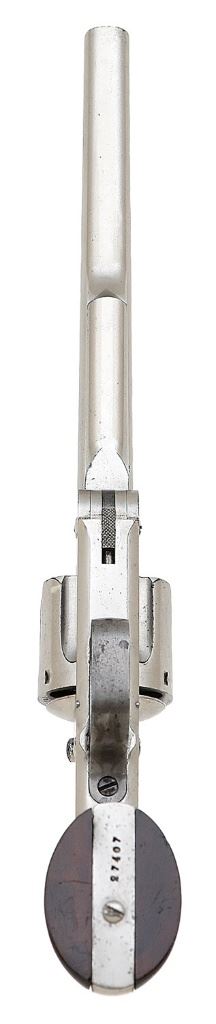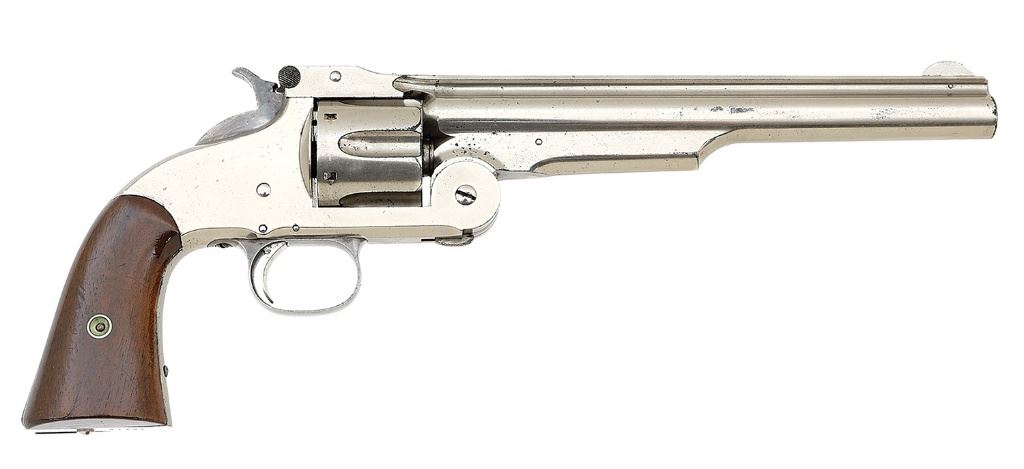 serial #27407, 44 S&W Russian, 8'' barrel with a good bore showing scattered light pitting and oxidation with some bright areas and otherwise strong rifling throughout. The metal surfaces of this lovely revolver retain about 95% original nickel finish showing some scattered light flaking and speckling to gray-brown patina, the nickel taking on an honest slightly clouded appearance from the years. The trigger and latch are also nickel-plated while the hammer and triggerguard retain fine case-hardened colors throughout, quite vibrant along the hammer and drifting somewhat to a smoky gray along the guard. The single line barrel address with patent dates and ''RUSSIAN MODEL'' callout remain crisp and the smooth walnut grips remain in very fine to near excellent condition showing some scattered light handling marks. The right panel is mismatched stamp-numbered ''26170'' and the remaining numbered parts are matching by assembly number. One of the extractor arms has broken off and been lost to the years but barrel-to-frame fit is solid and the action is crisp and seems to function well mechanically. An excellent standard commercial production First Model Russian. (13D10826-686) {ANTIQUE} [Dr. W. Lloyd Hudson, Jr. Collection] (7000/9000)