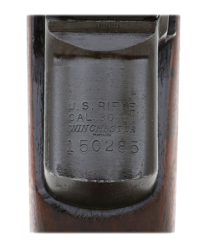 serial #150285, 30-06, 24'' Winchester barrel with a very good lightly oxidized bore, greater in the forward half, but still showing strong rifling throughout. The metal surfaces retain about 75-80% original Parkerized finish with light wear on high edges and contact points, the stock metal and gas cylinder largely toned to a pewter-gunmetal patina with strong remnants of Dulite blue in the protected areas of the cylinder, and some mild oxidation staining and handling marks. The walnut stock is in very good condition as cleaned with scattered old abrasions and light dings, softened with age, as well as scattered handling marks. The right side of the stock shows the faint remnants of a boxed ''SA / SPG'' inspector's cartouche, and a nearly invisible circled ''P'' is marked behind the triggerguard; the checkered steel buttplate with trap is intact. The receiver markings are intact and crisp, the Winchester barrel drawing number beneath the rear handguard, and the small parts show Winchester drawing numbers, including the unrelieved operating rod. The rifle features the standard open sights with flushnut rear sight drums, the front sight with Winchester flared ''wings'' and the screw cap still intact, a milled triggerguard, and an appropriate single slot gas cylinder screw. After Winchester's initial educational run of rifles, a contract was made for 65,000 further rifles, numbered 100,501-165,500 with production commencing in February 1941; later contracts would be assigned serial number blocks beginning at 1,200,000. An honest early production Winchester M1 Garand that avoided arsenal refurbishment. (14B11633-20) {C&R} (1500/2000)