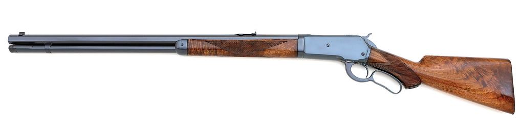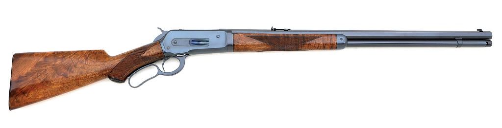serial #135823, 50 Express, 26'' octagon barrel with a full magazine and an about very good bore showing light pitting, greater towards the chamber, but still with clear rifling throughout. The metal surfaces of this 1905-vintage rifle retain about 99% excellent quality restored rust blue with beginnings of operational wear on the magazine tube from takedown and some scattered previous pinprick pitting beneath the finish. The checkered capped pistolgrip deluxe walnut stock and forend are in excellent condition as professionally restored showing only the remnants of miniscule chipping at the base of the forend and a light handling mark or two, the steel widow's peak buttplate just a touch proud at the toe. The stock displays lovely feathercrotch figure through the butt, and the stock and buttplate match the ''803 XX'' assembly number on the lower tang. The metal markings are intact and clear with the barrel address appearing restruck, though the barrel appears original as the underside of the barrel shows the correct factory markings. The rifle is sighted with a beaded blade ''Winchester Express'' front sight and a ''Winchester Express'' rear sight with one standing and one folding leaf with platinum inlaid line, marked for 50 and 200 yards, and the takedown functions correctly. A nicely restored Model 1886 in a desirable cartridge. (14B11631-7) {C&R} (4000/6000)