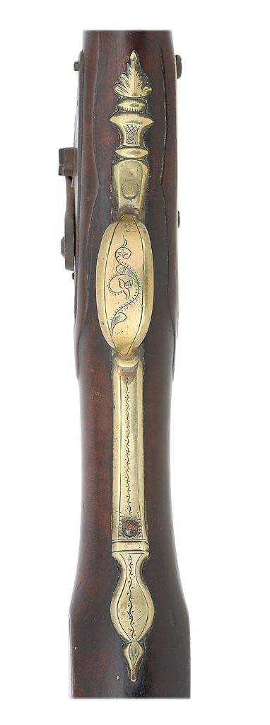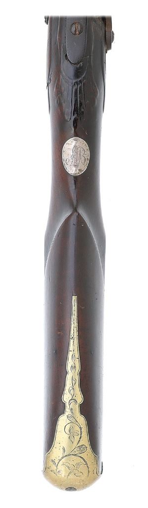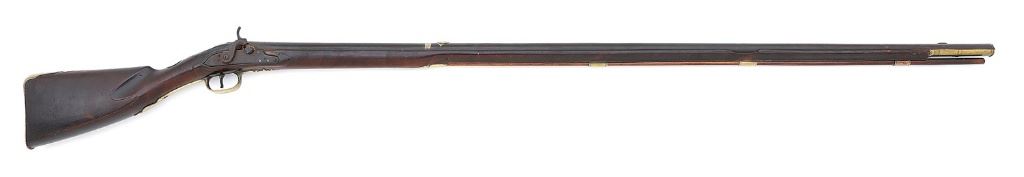 About .75 cal., 51 1/2'' round barrel with an oxidized bore. This is a very handsome and attractive club butt fowler, following very closely the contours and construction of the French ''buccaneer'' guns issued by the French Navy for topsail firing. The barrel itself is an overall very pleasing smooth plum brown patina showing light incise engraving with medial rings at the breech, a brass banded appliqué about a 12'' forward with light incise engraving and a raised chiseled face, much of the detail lost to the years due to the soft nature of the brass, with dual medial rings ahead of this. Nearer the muzzle we find a simple scant brass blade front sight and there is actually a seam about 8 1/2'' from the muzzle which can be detected, however it appears original in every respect to the gun and not an example of ''stretching'' as the interior is seamless and exhibits the same oxidation its full-length, and a very close inspection of the stock shows absolutely no evidence of it being stretched. The gun is a later percussion conversion by the drum and nipple method and features a T. Ketland & Co. lock with a gunsmith-made percussion hammer, the plate fitting the inletting of the stock very well. This example has the oft-seen brass nose plate about 5'' in length with small medials, it being somewhat loose, its retaining pin not present. There are four simple ramrod thimbles and a simple tailpipe while the triggerguard has a fleur-de-lis front extension and beveled edges with very light incise engraving. There is a flat sideplate which is lightly engraved and the heavy brass buttplate has a slightly ornate tang with light incise engraving as well. The stock itself appears to be a tight grained maple or other hardwood with a rich tobacco-russet color and blackened soot and grime from the years within the recesses, adding to the extremely honest untouched character of the arm. There are of course the expected light dings and handling marks here and there, with a few small chips or cracks along the barrel channel. Both flats have light islands with scallop shell carving to the rear of the tang and very French deep comb flutes with a light incise groove carved. There is a silver oval monogram plate atop the wrist neatly engraved ''SB'' and there is an antique ramrod included which is likely a replacement. The arm is strikingly similar to examples seen in Flintlock Fowlers The First Guns Made in America © Grinslade 2005, in the chapter on club butt fowlers. While the stock appears very much to be Yankee wood, the balance of the arm is very French in its in character, especially the applied face atop the barrel, it is very possibly a Yankee restock utilizing the same stock design as the original parent musket. An extremely attractive and honest club butt musket measuring 67'' overall length. (3D11739-95) {ANTIQUE} [Former Peter Tillou Collection] (4000/6000)