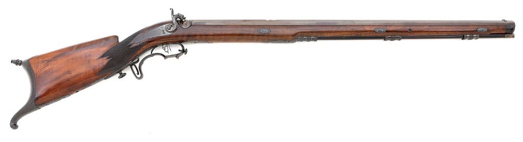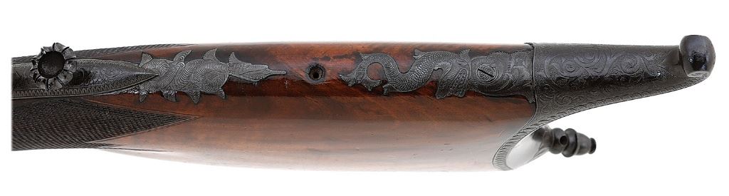 Lot 365 New Orleans Fullstock Percussion Schuetzen Rifle by Louis Gerteis with Attractive Dolphin Motifs