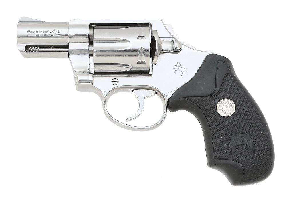 serial #SV7576, 38 Special, 2'' full lug heavy barrel with an excellent bore. In 1996 Colt planned a special run of 600 of their ''Special Lady'' revolvers, but only about 250 were produced making them an exceedingly rare find. They built them on their Model 38 SF-VI revolver with a number of features that would be attractive to the female concealed carry sect. This beautiful gun shows minimal use, while the brightly polished stainless steel surfaces remain in superb condition. The smooth polished combat trigger rates excellent and the hammer has been factory ''bobbed'' and is also polished bright. The checkered rubber factory Pachmayr Compac grips remain in excellent condition. The grips have silver Rampant Colt medallions and each panel has a molded-in banner with the word ''COLT'' in the center of each side. The left side of the barrel is roll marked ''Colt Special Lady'' in script, it features fixed sights, and correctly times and locks up. It includes the original factory hard case that is correctly end labeled and numbered to the gun, manual, and paperwork. A spectacular opportunity for the advanced collector to obtain a rare variant in amazing condition. (8B11739-7) {MODERN} (5000/7000)