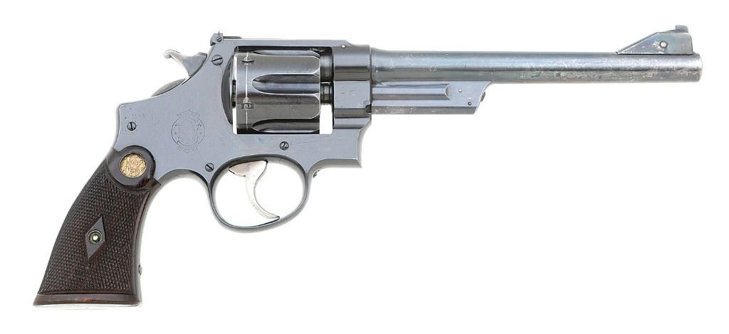 serial #02, 44 Special, 7 1/2'' barrel with an excellent bore. This unusual Triple Lock has custom sights, low serial number, and factory rework mark (diamond). A check with knowledgeable sources have not been able determine the background of this interesting low numbered revolver. Perhaps it was meant as a club gun due to the target sights or was used for experimental purposes. It retains about 92% original blue although the sideplate appears to have been refinished and it shows thinning finish on the straps, edge wear, the barrel is showing light thinning under strong light, scattered very light freckling, and handling marks. The service trigger and hammer retain full case-hardened colors. The diamond checkered walnut factory grips feature gold S&W medallions and remain in about excellent condition showing minor wear and handling marks. A previous owner has written his name and information on the rear of each panel and any factory numbers are no longer visible although the fit is quite good. This gun has a custom period Patridge front sight on a ramp that is attached to the original target sight base, the original target rear sight slider (blade) has been removed and taller square notch one added. The cylinder, extractor, and crane have a simple #2 stamped on them and no number was found on the barrel. Markings on the barrel are crisp while the S&W logo on the sideplate is soft. An intriguing First Model Target in fine condition. (8B9100-703) {C&R} [Richard ''Stretch'' Kennedy Collection] (3000/5000)