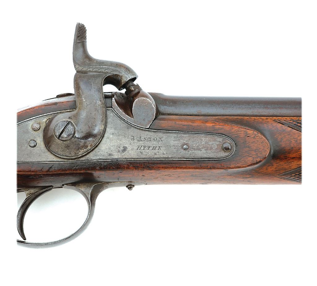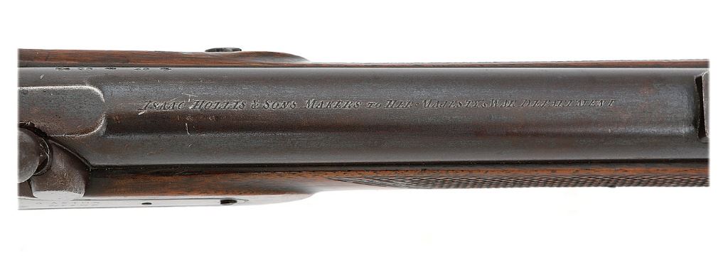 .577 cal., 36'' barrel with a bright excellent bore. This rare ''Hay Pattern'' or ''Medium Enfield'' rifle was designed by Colonel Charles Crawford Hay, the first commandant of the School of Musketry located in Hythe, Kent. Hay's experiments with the Pattern 1853 rifle-musket proved that a faster rifling twist rate, and a shorter 36'' barrel was ideal for the current service load. Testing also revealed that moving the rear sight forward on the barrel created a better sight picture. The ''Hay Pattern Enfield'' he designed incorporated these findings in addition to a rear sight graduated to 1150 yards, fittings made of ''gun metal'' (bronze), and a rear sling swivel moved from the front of the triggerguard to the rear of the elongated tang. Though the Board of Ordnance never adopted Hay's pattern for general use, the accuracy of his design was popular with target shooters and volunteers who acquired these rifles from commercial makers. The barrel of this rare rifle retains about 70% original blue thinning and toning to plum-brown patina under bright light with a few small dings between the middle and upper bands, some light pitting and wear near the muzzle, and some expected light handling marks. The fittings, which are iron rather than bronze, are toning to a dark gray patina with some scattered areas of light pitting and old light oxidation. Iron fittings are found on other Hay pattern Enfields, as evidenced by the included and extremely helpful description of another example by Tim Prince of College Hill Arsenal. The protected areas of the lockplate are toning to a pewter case-hardened patina and it is crisply marked ''J. ASTON / HYTHE.'' The left side of the breech also shows clear Birmingham proofs and ''25'' caliber markings, and the top of the barrel bears ''ISAAC HOLLIS & SONS MAKERS to HER MAJESTY's WAR DEPARTMENT.'' The checkered walnut stock rates very fine with some scattered expected dings and light handling marks. The checkering remains sharp and there is an unengraved monogram plate on the toe line. The nipple protector and chain have been lost to the years, the original sights, ramrod, and Palmer patent clamping bands and locking screws are intact, and the action is strong and crisp. This is a wonderful opportunity for the Enfield or British martial collector to add a very fine example of these rare rifles to their collection. (23D11415-4) {ANTIQUE} (4000/6000)